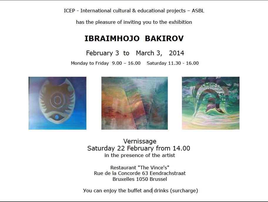 ICEP - International cultural & educational projects – ASBL Ибрагим Бакиров выражает себя через рисунок, живопись, скульптуру, фотографию. Но самым важным инструментом самовыражения он считает чувственность тела. Именно она, в совокупности с многогранной мобильностью восприятия, рождает новый мир красок, форм, линий. Мир, в котором живут гармония движения и гармония покоя.