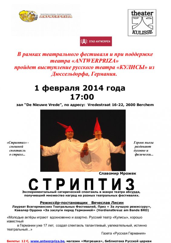 Славомир Мрожек. В рамках театрального фестиваля и при поддержке театра « Антверприза » пройдет выступление русского театра « Кулисы » из Дюссельдорфа, Германия, который покажет экспериментальный сатирический спектакль « Стриптиз », по пьесе Славомира Мрожека. Режиссер-постановщик — Вячеслав Лисин, лауреат Всегерманских Театральных Фестивалей, Приз « за лучшую режиссуру », Кавалер Ордена « За заслуги перед Германией » (Verdienstkreuz am Bande BRD). « Молодые актёры играют вдохновенно и азартно. Русский театр « Кулисы », хорошо известный в Германии уже 17 лет, создал спектакль талантливый, увлекательный, истинно театральный... »