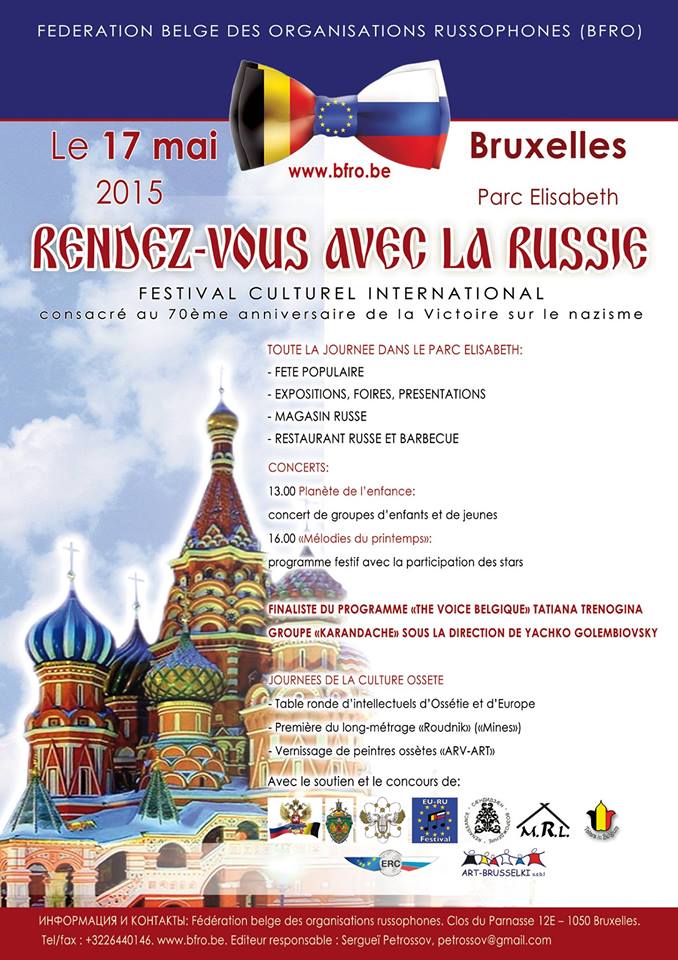 Voici le lien vers la liste des événements - une trentaine déjà - repris pour ce mois de mai 2015. Nous y relevons par exemple : La tournée « Russian legends » du nouveau spectacle de Mikhaylo Markovitch qui s'étale du 14 au 23 mai ;La reprise du festival international « Rendez-vous avec la Russie » au Parc Elisabeth et ce avec la présence cette année du groupe de musique russe et tsigane « Karandash » ;Les prochains concerts « Acoustic de-Tension » d'hôtes milanais organisés à l'hotel Aloft et à la « Ronde Musicale » ;La soirée théâtre proposée par Nathalie Reingardt au Centre Culturel de Russie à Bruxelles. Y seront joués en langue russe des extraits de pièces de Gogol, Pouchkine, Tolstoï et Zagoskine ;Enfin, Lire la suite... car suivent aussi assemblées, concerts, expositions, excursions, folklore et vente d'art. Note : sous la rubrique bibliographie et en lecture => la traduction en russe de l'ouvrage de Marie-Pierre Rey intitulé « L'effroyable tragédie : Une nouvelle histoire de la campagne de Russie » vient de paraître en lanque russe à Moscou sous le titre « Страшная трагедия. Новый взгляд на 1812 год » aux éditions Российская политическая энциклопедия.
