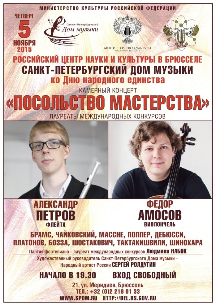 Александр Петров (Флейта) и Федор Амосов (Виолончель) Русский центр науки и культуры в Брюсселе, Санкт-Петербургский дом музыки ко дню народного единства. Камерный концерт « Посольство мастерства ». Лауреаты международных конкурсов Александр Петров (Флейта) и Федор Амосов (Виолончель). Брамс, Чайковский, Массне, Поппер, Дебюсси, Платонов, Бозза, Шостакович, Тактакишвили, Шинохара. Партия фортепиано - лауреат международных конкурсов Людмила Набок. Зудожественный руководитель Санкт-Петербургского дома музыки - Народный артист России Сергей Ролдугин.