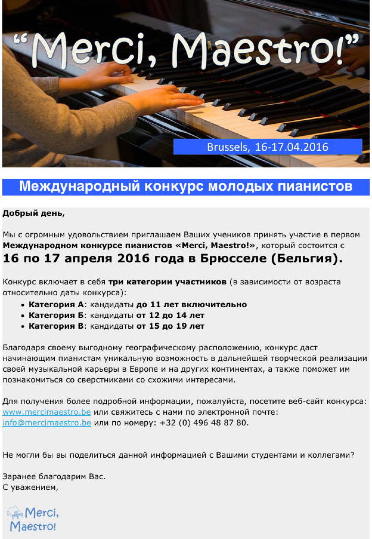 Nos événements en 2016 Centre interculturel Slavianka ART asbl Nouvelle activité : Atelier Théâtre avec Irena Snytko ; 16 janvier à 18h - Fête de Noël Slave, soirée festive des membres de l’association ; 6 février à 18h - Concert « Chansons par Alina Maton », romances, chansons populaires. Sur réservation : PAF 10€ (8€ membres, abonnés) ; 8-12 février - Stage « Matinée en musique », pour les enfants de 5 à 10 ans. Programme du stage ; 13 février à 18h - Soirée poésie. George Yréval, et Yang Ming « La poésie d'amour, entre la Belgique, la Russie et la Chine », intermezzo musical* ; 5 mars –à 18h Soirée VIP, Concert du groupe pop-folk franco-russe « Vesna », Sur réservation : PAF 12.50€ (10€ membres, abonnés) ; 19 mars à 18h- Soirée « À la croisée des cultures : Ukraine », au Centre laïque d'Angleur, place Andréa Jadoulle 14, Angleur, réservations : angleur.laicite at gmail dot com ; 16 avril à 18h- Concert « La Femme, L’Amour et l’Opéra », par Victoria Adams (Oksana Goncharuk). Sur réservation : iPAF 10€ (8€ membres, abonnés) ; 7 mai à 15h - Concours de piano pour le tout petits « Pia-pia-piano » ; 21 mai à 18h – Soirée festive « Vichivanka », broderie ukrainienne* : Vente de chemises brodées ukrainiennes, repas traditionnels ukrainiens, Dress code : porter une broderie ukrainienne, Sur réservation : PAF 30€ (25€ membres, abonnés) ; 4 juin à 18h Soirée VIP - Concert de Nicolas Martin, piano, http://www.nicolas-martin.com/ Sur réservation : PAF 10€ (8€ membres, abonnés) ; 18 juin à 18h - Concert « Nos talents », par l’atelier chant et cours de chant accompagnée ; 25 juin à 15h - Concert de Piano par les élèves de classe de piano. * animation par artistes de Slavianka ART Project Au plaisir de partager cette année musicale avec vous! Dimitry, Anna, Valéry, Helena, Nadia, Adèle, Alina et Sacha pour l’équipe de Slavianka ART, nka