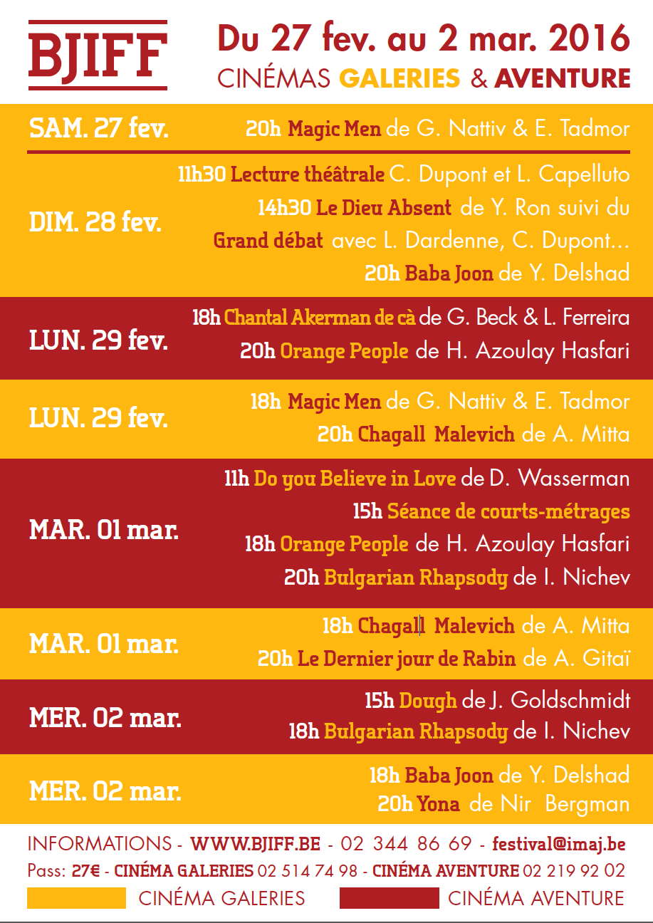 17th Brussels Jewish International Film Festival (BJIFF) une initiative de l'asbl IMAJ Cinéma GALERIES Samedi 27 février 2016 - 20h Magic Men de G. Nattiv & E. Tadmor Dimanche 28 février 2016 - 11h30' Lecture théâtrale de C. Dupont & L. Capelluto - 14h30' Le Dieu Absent de Y. Ron suivi du Grand débat avec L. Dardenne, C. Dupont... - 20h Baba Joon de Y. Delshad Lundi 29 février 2016 - 18h Magic Men de G. Nattiv & E. Tadmor - 20h Chagall Malevich d'Alexandre Mitta Mardi 1 mars 2016 - 18h Chagall Malevich d'Alexandre Mitta - 20h Le Dernier jour de Rabin de A. Gitaï Mercredi 2 mars 2016 - 18h Baba Joon de Y. Delshad - 20h Yona de Nir Bergman