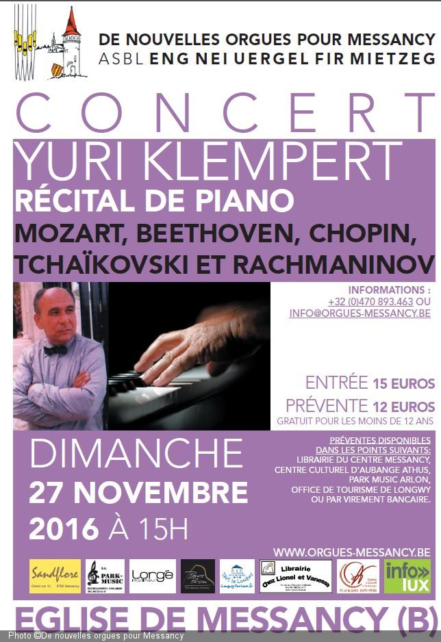 L’asbl De nouvelles orgues pour Messancy a le plaisir d’accueillir un artiste d’exception, le pianiste Yuri Klempert, issu du conservatoire Moussorgski d’Ekaterinbourg en Russie, un rendez-vous à ne pas manquer le dimanche 27 novembre à 15h à l’église de Messancy. Yuri Klempert vous offrira un très beau moment musical avec des pièces romantiques et classiques. Au programme : - Fantaisie en ré et sonate n°16 de Mozart, une des plus célèbres sonates pour piano de Mozart. - La sonate pathétique de Beethoven dont la mélodie de l’adagio a été largement reprise au cinéma et dans la publicité. - Chopin avec cette très belle valse opus 64, Fantaisie-Impromptu, nocturne opus 9 et Scherzo opus 31, morceau captivant avec une diversité de couleurs et sentiments. - Les saisons de Tchaïkovski – 4 extraits choisis par le pianiste : Février « Le Carnaval » - Juin « La Barcarolle » Octobre « Chanson d’automne » - Novembre « Troika » - Prélude opus 23 de Rachmaninov, un des plus connus du compositeur.