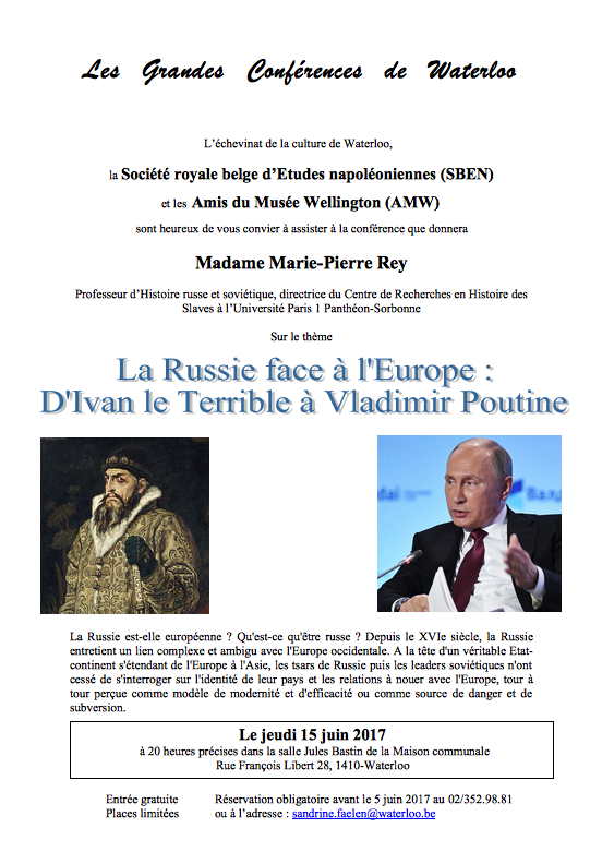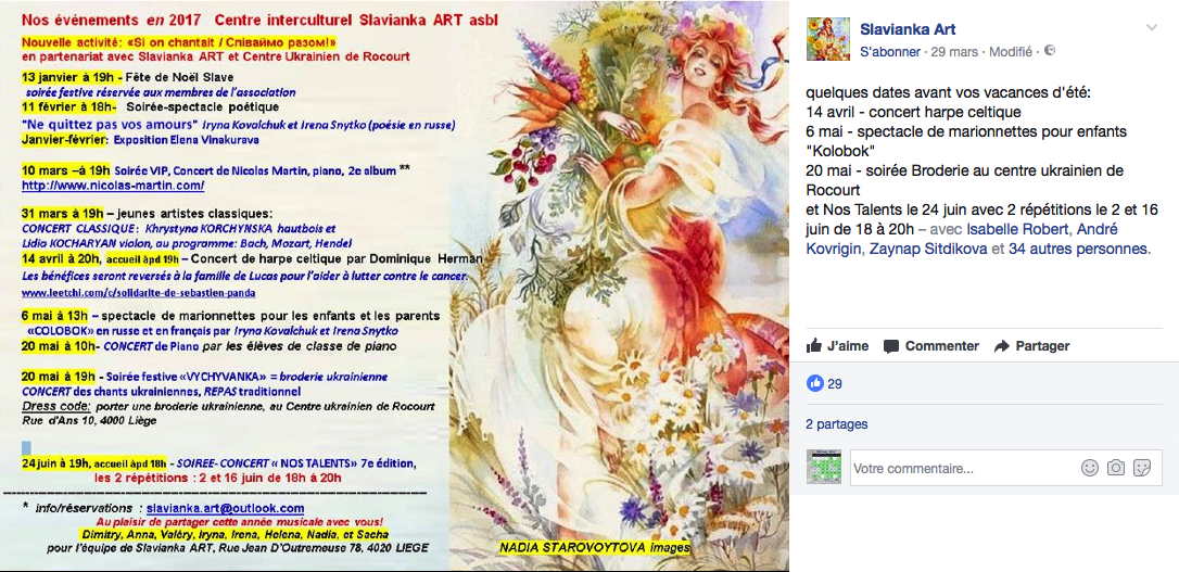 | Calendrier vava.be juin 2017 | | Liste des intitulés | Album des affiches/illustrations | Descriptifs détaillés Annonce :=> 27-29 Silenis casting : Recherche chorale d'enfants et d'hommes russes (Binche) Concerts :1 => Compositions by Tigran Maytesian (Woluwé-Saint-Lambert) 2 => Caravane Gipsy (Ittre) 11 => Pouchkine : Je me souviens d'un moment merveilleux... (Saint-Josse) 11 => Harfa i Szopen (Chênée) 15 => Duo russo-polonais (Paris) 24 => Soirée-concert Nos talents (Rocourt) Cinéma :1 => Теваник (Saint-Josse) Expositions :2 => Véronique Kalitventzeff (Crupet) Excursions/visites :4 => Luxembourg 4 => Jardin botanique (Meise) 7 => Seurat et Ensor (Bruxelles) 10 => Belgisch ambachtelijk bier (Antwerpen) 10-17 => Летний Дом Отдыха (Ardennes) 11 => Koblenz/Bad Ems 17 => Paris 24-25 => Normandie Conférences :13 => Vladimir Fédorovski : Poutine de A à Z (Bruxelles) 15 => Marie-Pierre Rey : Histoire de la Russie d’Ivan le Terrible à Poutine (Waterloo) 16 => Тургеневский салон (Saint-Josse) Théâtre :3 => Брюссельские маски (Saint-Josse) 10 => Alice (Antwerpen) 10 => Что подумают соседи ? (Etterbeek) Réunions :3 => A la croisée des cultures : Russie (Angleur) 3 => Poesjkin en zijn vrienden (Laken) 10 => Здравствуй, Лето! (Francfort) 16 => Assemblée générale FPPR (Bruxelles) Innovation :5 => French Tech Tour en Russie (Moscou) 8 => Russian innovative regions (Bruxelles) Célébration :21 => Tricentenaire de l’arrivée de Pierre le Grand en Province de Liège (Liège) Bibliographie :Max Gallo : 1917 – Une passion russe. Vidéographie :Cette icône vidéo  pointe vers des enregistrements de conférences ou d'émissions récentes qui n'ont parfois pas été détectées en leur temps. |
