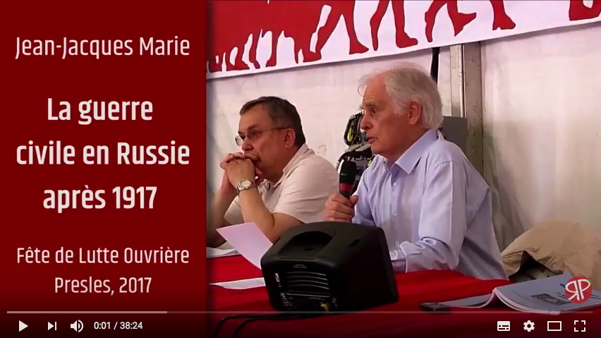 Jean-Jacques Marie Fête de lutte ouvrière à Presle, 2017 A 100 ans de la révolution russe, celle-ci était à l'honneur à la fête de Lutte Ouvrière de 2017. Historien, militant, et auteur de nombreux ouvrages sur la Russie, l'URSS et le trotskysme, Jean-Jacques Marie présente ici un exposé sur la guerre civile en Russie après 1917.