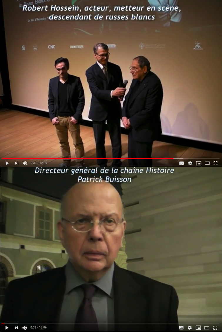 Reportage Ekaterina Bogopolskaia Robert Hossein, acteur, metteur en scène, descendant de russes blancs En 1922, des Russes blancs exilés en France créent la société de production Albatros, à Montreuil. Récit passionnant de cette aventure cinématographique autour de producteur Alexandre Kamenka et l'acteur Ivan Mosjoukine par Alexandre Moix (diffusion chaîne Histoire): L'interview de Patrick Buisson, directeur de la chaîne histoire et d'A. Moix; l'intervention courte de Robert Hossein. Web-magazine Affiche Paris-Europe/www.afficha.info Trouvez ci-dessous un lien pour visionner l'interview de Patrick Buisson, à propos de l'immigration de ce qu'on appelle "les Russes blancs". Bon visionnage, amicalement votre. Dimitri Korniloff