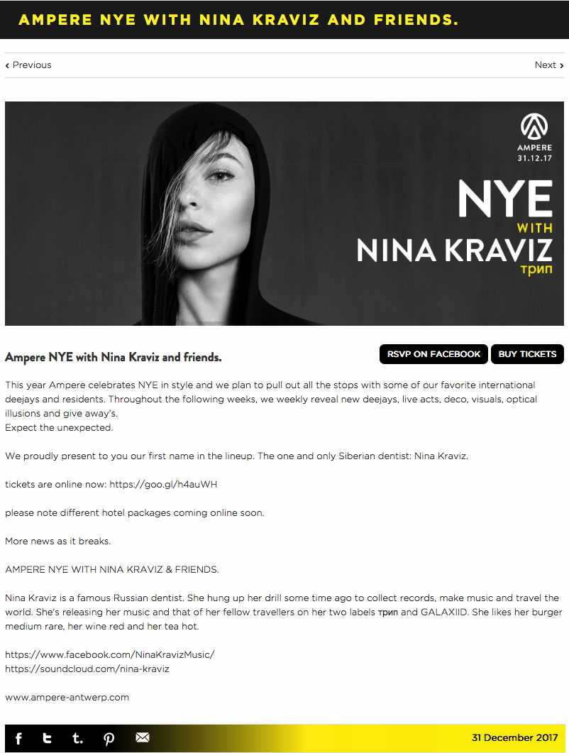 Public · Organisé par Ampere et Nina Kraviz Ampere NYE with Nina Kraviz and friends. This year Ampere celebrates NYE in style and we plan to pull out all the stops with some of our favorite international deejays and residents. Throughout the following weeks, we weekly reveal new deejays, live acts, deco, visuals, optical illusions and give away’s. Expect the unexpected. We proudly present to you our first name in the lineup. The one and only Siberian dentist : Nina Kraviz. Nina Kraviz is a famous Russian dentist. She hung up her drill some time ago to collect records, make music and travel the world. She’s releasing her music and that of her fellow travellers on her two labels трип and GALAXIID. She likes her burger medium rare, her wine red and her tea hot.