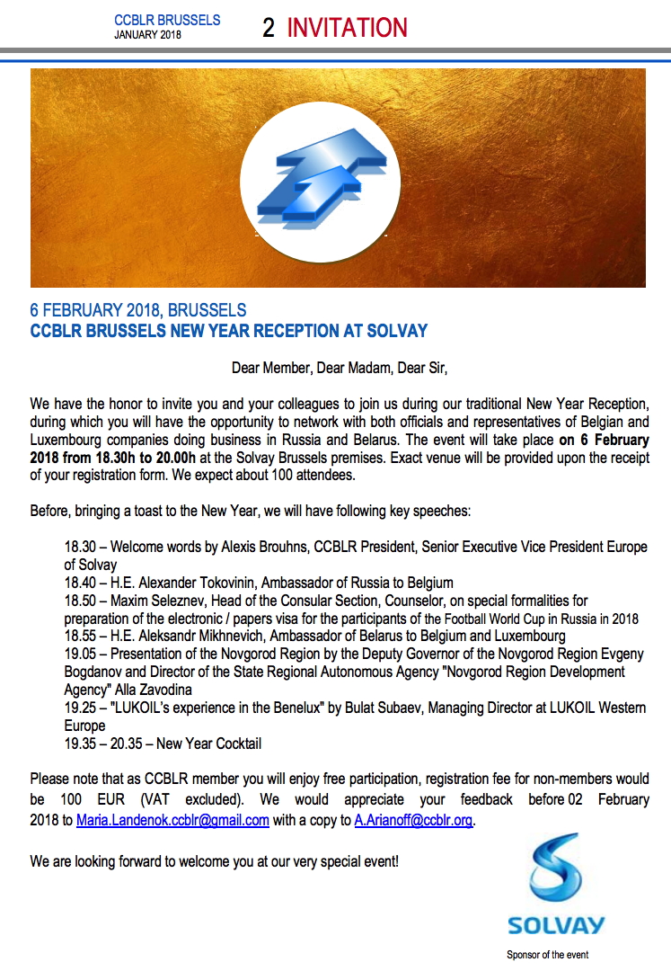 Dear Member, Dear Madam, Dear Sir, We have the honor to invite you and your colleagues to join us during our traditional New Year Reception, during which you will have the opportunity to network with both officials and representatives of Belgian and Luxembourg companies doing business in Russia and Belarus. The event will take place on 6 February 2018 from 18.30h to 20.00h at the Solvay Brussels premises. Exact venue will be provided upon the receiptof your registration form. We expect about 100 attendees. Before, bringing a toast to the New Year, we will have following key speeches : 18.30 – Welcome words by Alexis Brouhns, CCBLR President, Senior Executive Vice President Europe of Solvay 18.40 – H.E. Alexander Tokovinin, Ambassador of Russia to Belgium 18.50 – Maxim Seleznev, Head of the Consular Section, Counselor, on special formalities for preparation of the electronic / papers visa for the participants of the Football World Cup in Russia in 2018 18.55 – H.E. Aleksandr Mikhnevich, Ambassador of Belarus to Belgium and Luxembourg 19.05 – Presentation of the Novgorod Region by the Deputy Governor of the Novgorod Region Evgeny Bogdanov and Director of the State Regional Autonomous Agency "Novgorod Region Development Agency" Alla Zavodina 19.25 – LUKOIL’s experience in the Benelux, by Bulat Subaev, Managing Director at LUKOIL Western Europe 19.35 – 20.35 – New Year Cocktail