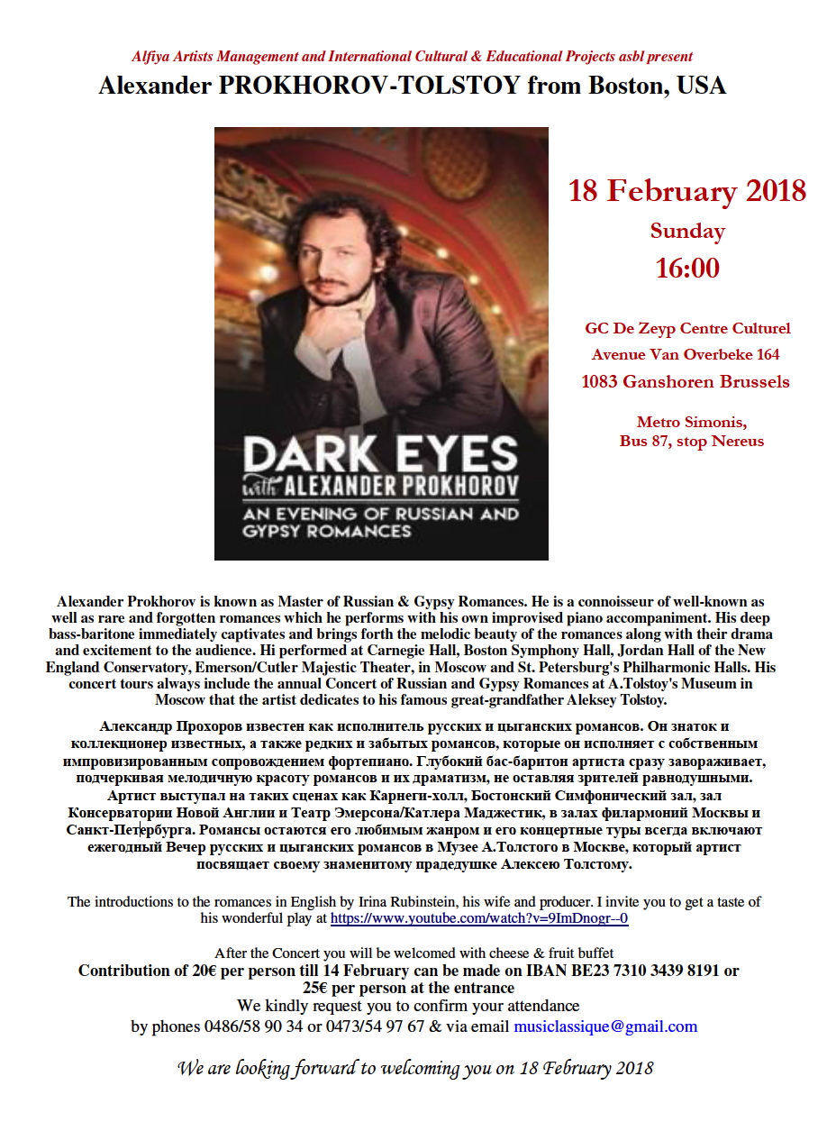 2 => Olga Mentchik op piano zingt « De stem van de wind » (Gent) 3 => Татарский национальный костюм (Saint-Josse) 3-4 => 9e Journées du livre russe et des littératures russophones (Paris) 4 => Ballet : The Lady of the Camellias (Kinepolis) 4,7,10,14,25 => ARINA Февральская афиша (Bruxelles) 5 => Conférence Michel De Grave. Compositeurs russes après 1917 (Woluwé-Saint-Lambert) 6 => Réception CCBLR New Year at Solvay (Bruxelles) 8 => Concert Vadim Piankov : « Le vol arrêté. Moscou-Luxembourg » (Luxembourg) 9 => Посольство Мастерства : Тимофей Доля и Роман Маркелов (Saint-Josse) 10 => Вечер-презентация литературного журнала « Берлин.Берега » (Francfort) 13,17,23,25 => Concert : une ballade finlandaise (Paris) 13 => Le nid de gentilshommes (Bougival) 14 => Концерт классической музыки « Валентинка » (Bruxelles) 18 => Dark Eyes. An evening of Russian and Gypsy romances (Ganshoren) 19 => Séminaire Aspects de l'Europe musicale chez Scriabine (Paris) 22 => Miroslav Kultyshev piano (Ixelles) 24 => Spectacle Вечер сплошного СМЕХова (Antwerpen) 27 => Entretien Andreï Gratchev, le prophète de l’avant-guerre (Bruxelles) 27 => Conférence Héléna Perroud. Un russe nommé Poutine (Paris) 28/2-4/3 => Excursion. В Ниццу на карнавал (Nice) Bibliographie : Épopée sibérienne. La Russie à la conquête de la Sibérie et du Grand Nord, par Éric Hoesli