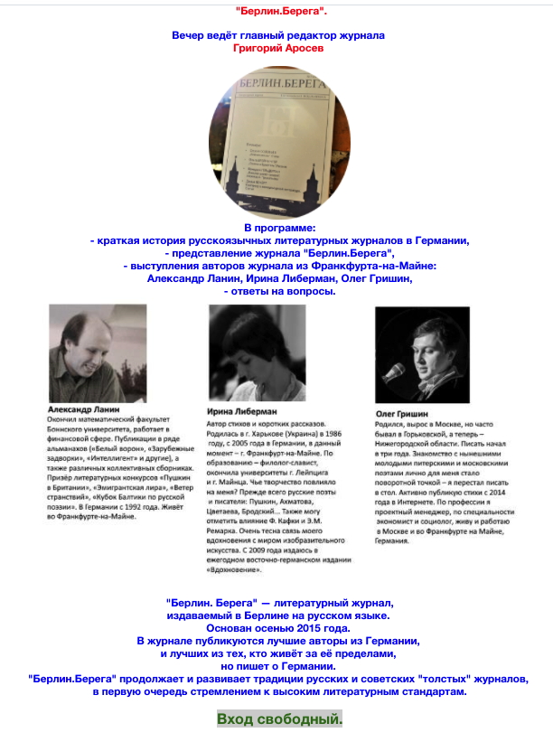 Дорогие друзья! Приглашаем вас в Гент 2 февраля на новую программу композитора Ольги Менчик « Голос Ветра », название которой было заимствовано из стихотворения А. Ахматовой « Ива ». Голос Ветра - для Ольги символ связи лучшей поэзии прошлого столетия с современным творчеством. Своей музыкой она доказывает, что вибрации Ахматовой не умерли, а продолжают жить и вдохновлять наших современников. Всю информацию о концерте вы найдете в афише. До скорой встречи! С уважением, Русский Бульвар, г. Гент.