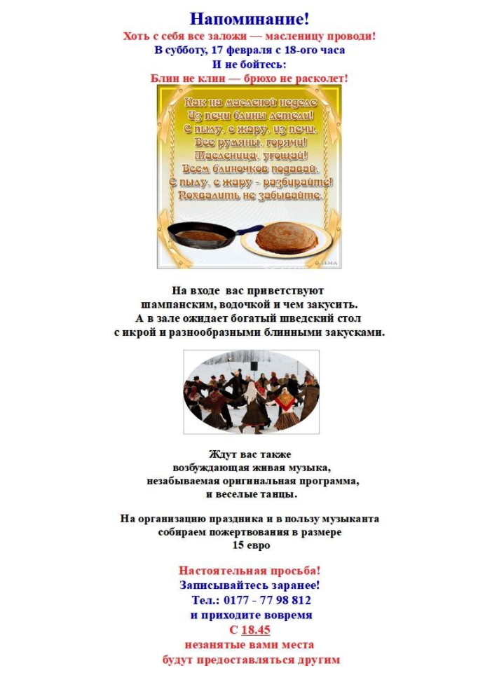 Резервация мест по телефону : 0484 69 36 07 / 0498 72 27 17 Предоплата обязательна – 150 евро Количество мест ограничено