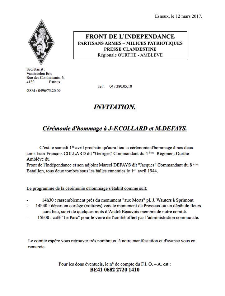 Front de l'Indépendance. Partisans armés - Milices patriotiques - Presse clandestine. Régionale Ourthe-Amblève C’est le samedi 1er avril prochain qu'aura lieu la cérémonie d'hommage à nos deux amis Jean-François COLLARD dit « Georges » Commandant du 4 ème Régiment Ourthe-Amblève du Front de l'Indépendance et son adjoint Marcel DEFAYS dit « Jacques » Commandant du 8 ème Bataillon, tous deux tombés sous les balles ennemies le 1er avril 1944. Le programme de la cérémonie d'hommage s'établit comme suit : 14h30 : rassemblement près du monument « aux Morts » pl. J. Wauters à Sprimont. 14h40 : départ en cortège (voitures) vers le monument de Presseux où un dépôt de fleurs aura lieu, suivi de quelques mots d’André Beauvois membre de notre comité. 15h00 : café « Le Parc » pour le verre de l'amitié offert par l’administration communale. Le comité espère vous retrouver très nombreux à notre manifestation et d'avance vous en remercie.