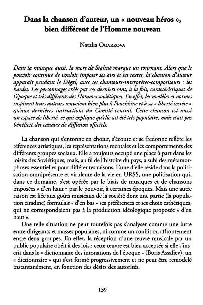 par Natalia Ogarkova, traduit du russe par Anna Louyest Dans la musique aussi, la mort de Staline marque un tournant. Alors que le pouvoir continue de vouloir imposer ses airs et ses textes, la chanson d'auteur apparaît pendant le Dégel, avec ses chanteurs-interprètes-compositeurs : les bardes. Les personnages créés par ces derniers sont, à la fois, caractéristiques de l'époque et très différents des Hommes soviétiques. En effet, les modèles et normes inspirant leurs auteurs renvoient bien plus à Pouchkine et à sa « liberté secrète » qu'aux dernières instructions du Comité central. Cette chanson est aussi un espace de liberté, ce qui explique qu'elle ait été très populaire, mais n'ait pas bénéficié des canaux de diffusion officiels. Chapitres : L'échec de la tentative pour créer une chanson soviétique, en rupture avec les chansons à la mode. Un tournat au début des années 1930. Les bardes et la chanson d'auteur : Alexandre Galitch (1918-1977), Boulat Okoudjava (1924-1997), Vladimir Vyssotski (1938-1980). Les héros de la chanson d'auteur.