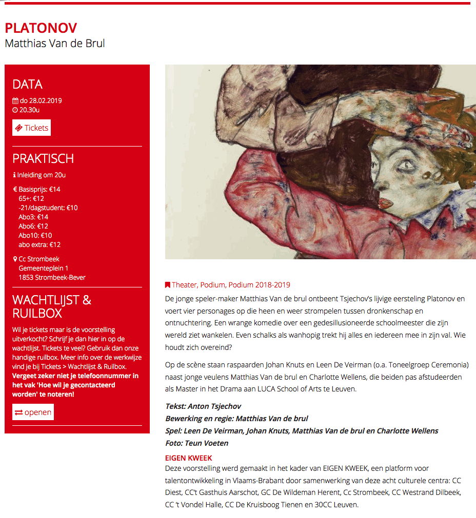 Matthias Van de brul Theater Podium Podium 2018-2019 De jonge spelermaker Matthias Van de brul ontbeent Tsjechov’s lijvige eersteling Platonov en voert vier personages op die heen en weer strompelen tussen dronkenschap en ontnuchtering. Een wrange komedie over een gedesillusioneerde schoolmeester die zijn wereld ziet wankelen. Even schalks als wanhopig trekt hij alles en iedereen mee in zijn val. Wie houdt zich overeind? Op de scène staan raspaarden Johan Knuts en Leen De Veirman (o.a. Toneelgroep Ceremonia) naast jonge veulens Matthias Van de brul en Charlotte Wellens, die beiden pas afstudeerden als Master in het Drama aan LUCA School of Arts te Leuven. Credits Tekst : Anton Tsjechov Bewerking en regie : Matthias Van de brul Spel : Leen De Veirman, Johan Knuts, Matthias Van de brul en Charlotte Wellens Foto : Teun Voeten Deze voorstelling werd gemaakt in het kader van EIGEN KWEEK, een platform voor talentontwikke-ling in Vlaams-Brabant door samenwerking van deze acht culturele centra: CC Diest,CC‘t Gasthuis Aarschot, GC De Wildeman Herent, CC Strombeek, CC Westrand Dilbeek, CC ‘t Vondel Halle, CC De Kruisboog Tienen en 30CC Leuven