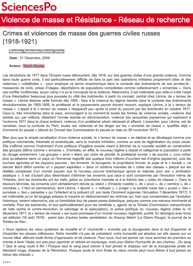 Werth Nicolas => Crimes et violences de masse des guerres civiles russes (1918-1921), page Internet SciencesPo. |
