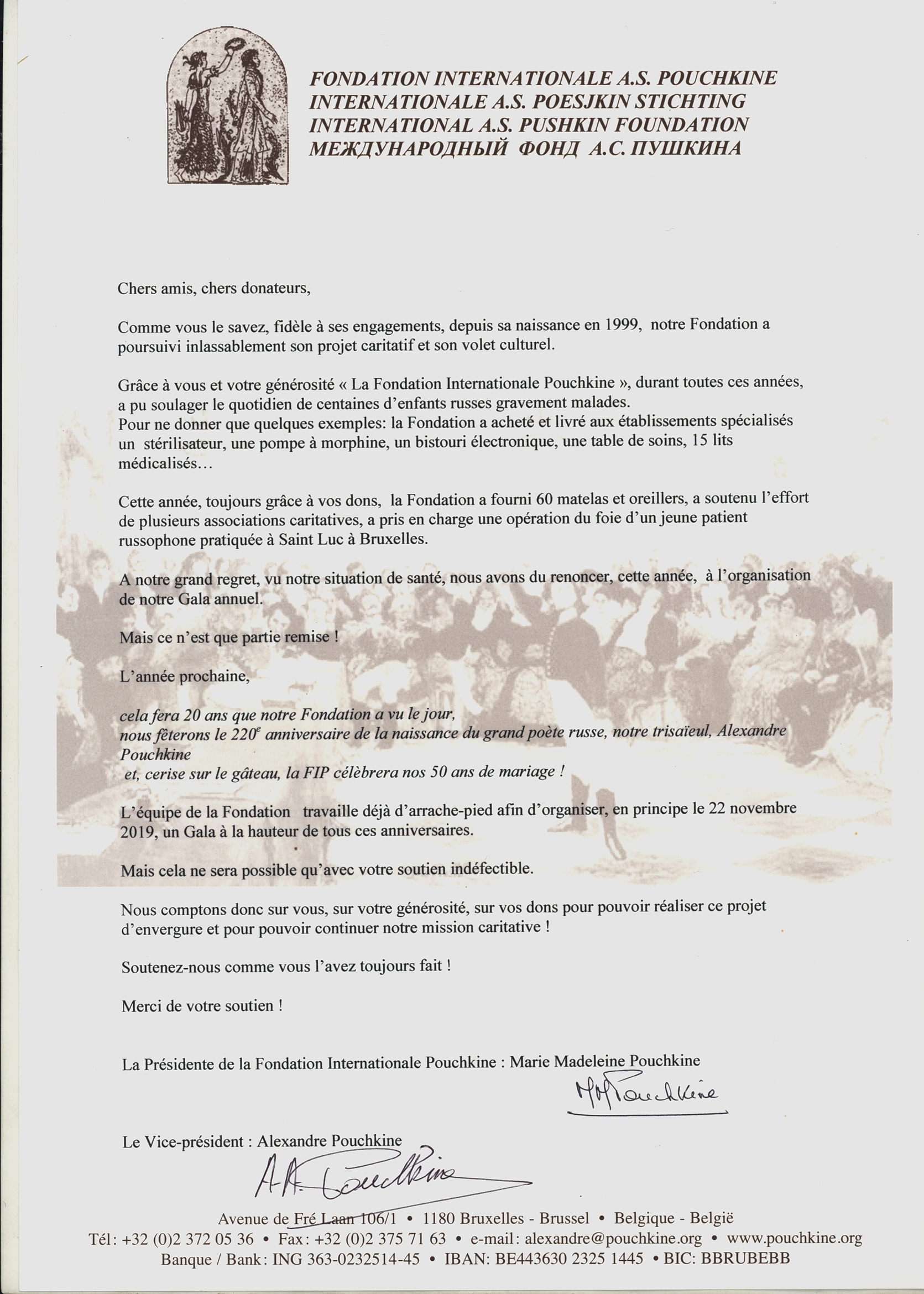 Fondation Internationale A.S. Pouchkine - Internationale A.S. Poesjkin Stichting - International A.S. Pushkin Foundation - Международный Фонд А. С. Пушкина. Chers amis, chers donateurs, Comme vous le savez, fidèle à ses engagements, depuis sa naissance en 1999, notre Fondation a poursuivi inlassablement son projet caritatif et son volet culturel. Grâce à vous et votre générosité « La Fondation Internationale Pouchkine », durant toutes ces années, a pu soulager le quotidien de centaines d'enfants russes gravement malades. Pour ne donner que quelques exemples : la Fondation a acheté et livré aux établissements spécialisés un stérilisateur, une pompe à morphine, un bistouri électronique, une table de soins, 15 lits médicalisés... Cette année, toujours grâce à vos dons, la Fondation a fourni 60 matelas et oreillers, a soutenu l'effort de plusieurs associations caritatives, a pris en charge une opération du foie d'un jeune patient russophone pratiquée à Saint-Luc à Bruxelles. A notre grand regret, vu notre situation de santé, nous avons du renoncer cette année, à l'organisation de notre Gala annuel.