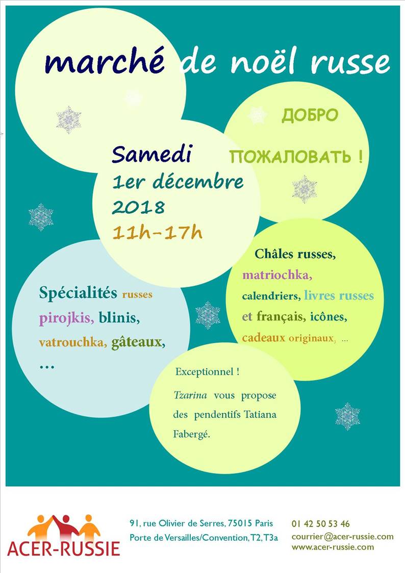 Marché de Noël de l’ACER-RUSSIE !! Добро пожаловать ! Le samedi 01 décembre 2018 11h-17h Retenez cette date ! Venez nombreux ! Invitez vos amis ! Faites circuler notre invitation! Buffet russe (Vatrouchkis, pirojkis, blinis, etc…etc) Cadeaux, objets russes, châles, livres russes et français, icônes peintes, bijoux, cartes de vœux, matriochki et tant d’autres choses ! N’hésitez pas à nous envoyer ou nous apporter des objets russes, cadeaux, objets neufs ou objets anciens, beaux livres russes ou français, bijoux, etc… Merci à tous de vos dons et de votre aide fidèle !