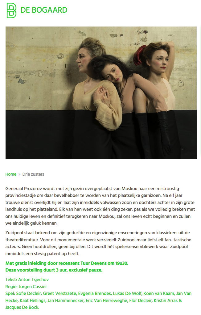 Er zijn weinig toneelteksten geschreven die zo universeel betekenisvol zijn, ongeacht het moment in de geschiedenis of het moment in een individueel mensenleven waarop ze worden opgevoerd. Veel meer dan naar de zussen en hun kleurrijke en bij tijden absurd-tragische entourage, kijken wij hier naar onszelf. En Tsjechov kijkt op zijn beurt vanuit het jaar 1900 naar ons en vraagt ons wat het is om mens te zijn, wat de zin van lijden is en waarom dat lijden altijd voorafgegaan moet worden door een onverzadigbaar verlangen naar het onmogelijke. Vragen waar de tijd geen vat op heeft zolang we mens zijn.
