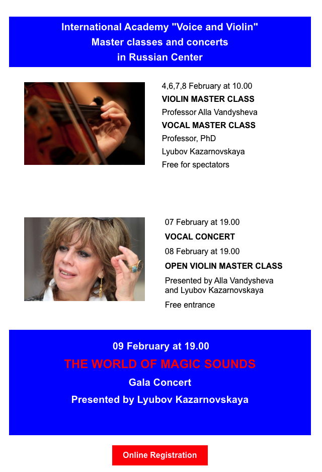 4,6,7,8 February at 10.00 / VIOLIN MASTER CLASS Professor Alla Vandysheva VOCAL MASTER CLASS Professor, PhD Lyubov Kazarnovskaya Free for spectators