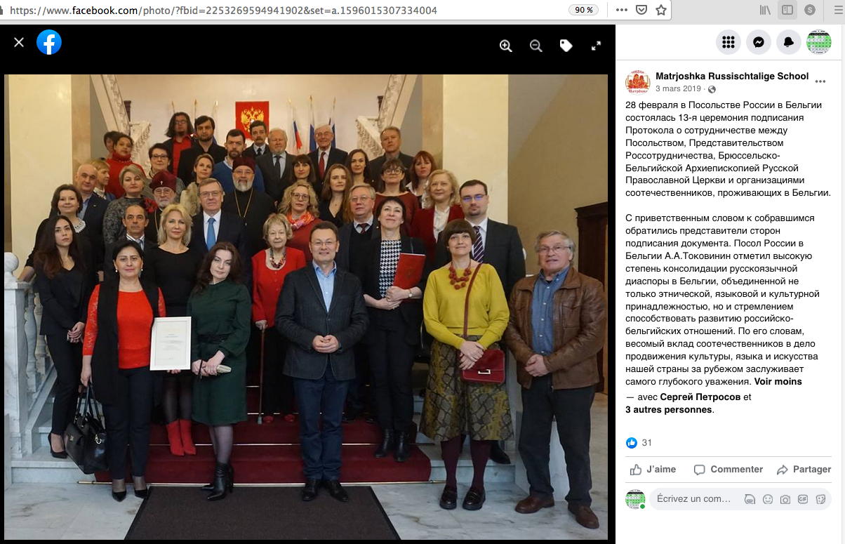 28 февраля в Посольстве России в Бельгии состоялась 13-я церемония подписания Протокола о сотрудничестве между Посольством, Представительством Россотрудничества, Брюссельско-Бельгийской Архиепископией Русской Православной Церкви и организациями соотечественников, проживающих в Бельгии. С приветственным словом к собравшимся обратились представители сторон подписания документа. Посол России в Бельгии А.А.Токовинин отметил высокую степень консолидации русскоязычной диаспоры в Бельгии, объединенной не только этнической, языковой и культурной принадлежностью, но и стремлением способствовать развитию российско- бельгийских отношений. По его словам, весомый вклад соотечественников в дело продвижения культуры, языка и искусства нашей страны за рубежом заслуживает самого глубокого уважения. — avec Сергей Петросов et 3 autres personnes .