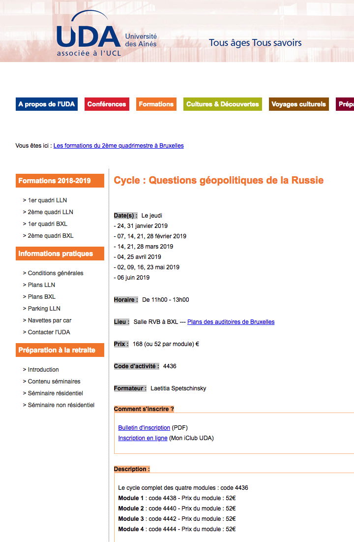 donné par Laetitia Spetschinsky. Université des Aînés Le cours couvre à la fois les acteurs et fondements de la politique étrangère russe et ses manifestations dans les grands dossiers d’actualité internationale, dans le domaine stratégique, économique et social. Les quatre modules peuvent être suivis individuellement ou l’un à la suite de l’autre. Chaque module est composé de 4 cours qui explorent différents aspects de la géopolitique eurasiatique. Le premier module (du 24/01 au 14/02/2019) propose un panorama de l’action de la Russie sur la scène internationale découpé en quatre leçons consacrées respectivement à : 1. la relation de partenariat et, simultanément, d’opposition avec l’UE 2. les enjeux de rivalité Est-ouest en Europe orientale et dans le Caucase 3. la politique étrangère et de sécurité russe au Moyen Orient 4. l'Asie centrale, enjeu de puissance pour la Russie post-soviétique
