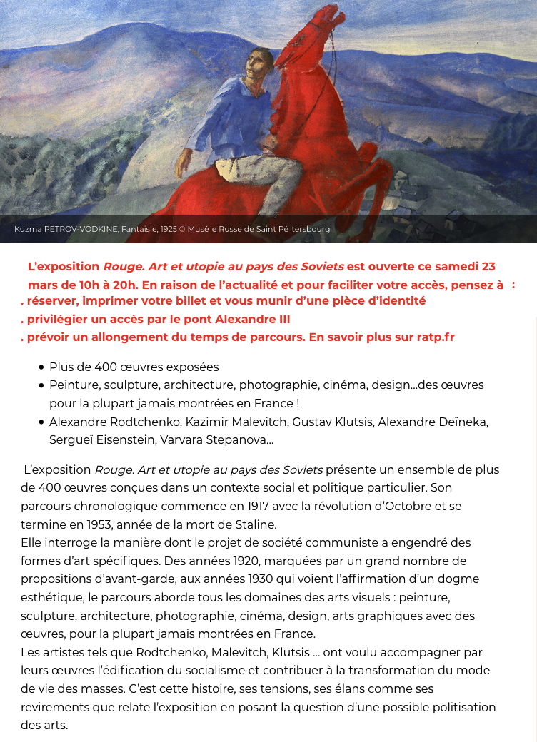 Plus de 400 œuvres exposées Peinture, sculpture, architecture, photographie, cinéma, design…des œuvres pour la plupart jamais montrées en France ! Alexandre Rodtchenko, Kazimir Malevitch, Gustav Klutsis, Alexandre Deïneka, Sergueï Eisenstein, Varvara Stepanova… L’exposition Rouge. Art et utopie au pays des Soviets présente un ensemble de plus de 400 œuvres conçues dans un contexte social et politique particulier. Son parcours chronologique commence en 1917 avec la révolution d’Octobre et se termine en 1953, année de la mort de Staline. Elle interroge la manière dont le projet de société communiste a engendré des formes d’art spécifiques. Des années 1920, marquées par un grand nombre de propositions d’avant-garde, aux années 1930 qui voient l’affirmation d’un dogme esthétique, le parcours aborde tous les domaines des arts visuels : peinture, sculpture, architecture, photographie, cinéma, design, arts graphiques avec des œuvres, pour la plupart jamais montrées en France. Les artistes tels que Rodtchenko, Malevitch, Klutsis … ont voulu accompagner par leurs œuvres l’édification du socialisme et contribuer à la transformation du mode de vie des masses. C’est cette histoire, ses tensions, ses élans comme ses revirements que relate l’exposition en posant la question d’une possible politisation des arts.