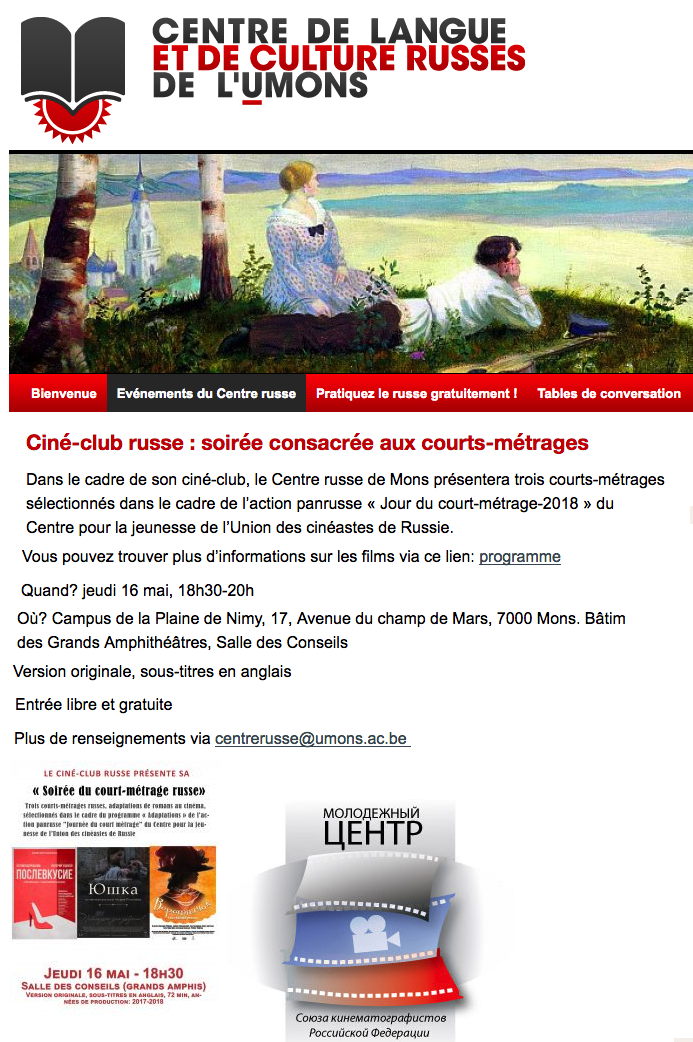 => 19/4 Black Horizon (Charleroi) => 1/6 Une saison russe (Thonon-les-Bains) => 1/6 Les russes Blancs de la Riviera (Saint-Jean de Braye) => 1/7 Exposition Rouge : Art et utopie au pays des Soviets (Paris) 1 => La Pâque Russe (F-75004 Paris) 1 => Communiqué Gallipoli (Paris/Bxl) 2,9,16,23 => Géopolitique Russie (WSL) 2 => 50 ans d'amour conjugal (Watermael) 3 => 2 tickets back (Liège) 4-5 => Excursion Baden-Baden/Strasbourg 5 => Action régiment immortel (Liège) 5,11 => Сказ о Егории Храбром (Leuven/Bxl/Antwerpen) 7-9 => SEAFOOD expo (Bruxelles) 7 => Russia & China - uneasy similarities (Gent) 7 => Кыся (Amstelveen) 8 => Donbas Residents' Response to UK & RU media (Gent) 9,16,21 => Volga éternelle (Saint-Péterbourg/Moscou) 9 => In memoriam (Evere) 10 => Александр Городницкий (Francfort) 10 => Ecrivains russes dans l'émigration (Ixelles) 11,15 => Au fil des fleuves de Russie (Saint-Péterbourg/Moscou) 11 => Golems de Bruno Schulz (Chênée) 11 => Ardennes flamandes (Geraardsbergen/Audenarde) 12 => Rendez-vous avec la Russie (Koekelberg) 15 => Land and Sea Silk Road (Bruxelles) 15 => Platonov (Diest) 15 => Red Haired Men (Brugge) 16 => Connecting Eurasia (Gent) 16-23 => Expo Fragments by Elvis Ways Art (Etterbeek) 16-24 => «Ваши пельмени» (Fürth) 17-26 => Александр Розенбаум tournée 2019 (Allemagne) 18-26 => JDA Travel 2019 (Moscou/Saint-Péterbourg) 19 => Carmen Suite/Petrushka - Bizet/Stravinsky (Kinepolis) 19-29 => Олег Винник (Fürth) 20-21 => CCBLR General Assembly + 3 events (Bruxelles) 22-23 => Test Russian language (Saint-Josse) 22 => Workshop CCBLR export products in Russia and EEU (Bruxelles) 25 => Excursion Hollande folklorique 26 => Живопись : до и после Брейгеля (Bruxelles) Bibliographie : Le régiment immortel. La guerre sacrée de Poutine, Premier Parallèle (Paris) Les anarchistes russes, Nada-éditions (Paris)