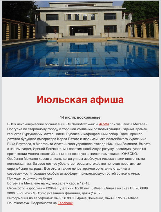 Стоимость €20/чел, оплата на счёт BE 26 0689 3006 5329 vzw De Bron с указанием Leuven, фамилии и даты (06.07.19). Информация по тел. 0474079535, Татьяна Румянцева, 0499283308 Ирина Донченко и на Facebook.