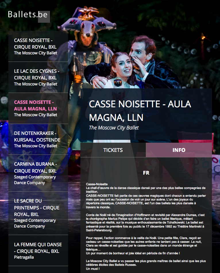 http://www.ballets.be/all/casse-noisette-aula-magna-lln?ts=info https://www.ticketmaster.be/event/nutcracker-the-moscow-city-ballet-tickets/33615 http://www.ballets.be/all/notenkraker-kursaal-oostende