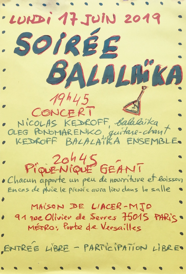 DIMANCHE 30 JUIN 2019 Centre Artima, rue Bleue 17, 75009 Paris, Journée porte ouverte de 14h à 20h Venez découvrir notre centre autour des ateliers de musique et de dessin, d’initiation à la langue russe, atelier d’improvisation théâtrale avec la régisseur de Saint-Petersbourg, ainsi que d’un concert d’orchestre de chambre de Novossibirsk à 18h30 L’orchestre de Novossibirsk va jouer des oeuvres de Dimitri Schostakovich commentées par la violoniste et musicologue Maria Christiany, diplômée de Conservatoire Supérieur de Moscou(Tchaikovski), ainsi que CNSM de Paris, titulaire de Certificat d’Aptitude. Ce concert pédagogique est dédié aux enfants à partir de 4 ans et leurs parents. L’entrée est libre avec une libre participation aux frais de l’association. Possibilité d’inscription à l’école franco-russe Artima pour 2019-2020 Concert Conservatoire de Bobigny, place de Libération 2, 93000 Bobigny FORUM CULTUREL FRANCO-RUSSE Paris – Moscou – Novossibirsk – Bobigny Une après-midi à la rencontre de l’Orchestre de Chambre de Novossibirsk. Ce concert va clôturer plusieurs jours de travail d’élèves français avec des professeurs russes. Organisé par l’association franco-russe « Artima » en collaboration avec le CRD de Bobigny Entrée libre sous réserve de places disponibles MERCREDI 3 JUILLET => Concert 18h : Conférences sur l’enseignement de la musique 19h30 : Concert Service culturel de l’Ambassade d’Azerbaïdjan, avenue Charles Floquet 1, F-75007 Paris FORUM CULTUREL FRANCO-RUSSE Paris – Moscou – Novossibirsk – Bobigny Concert unique des solistes russes, professeurs des Conservatoires Supérieurs de Musique de Moscou et de Novossibirsk. Solistes : Marina Kuzina, violon, Novossibirsk Maria Christiany, violon, Paris Tamara Kudelich, piano, Moscou Nikita Tokarev, trompette, Moscou Pavel Dashkin, violoncelle, Novossibirsk Arthur Thomassin, compositeur et directeur du CRD de Bobigny Tatiana Yurkova, soprano, Paris Lora Korneeva, clavecin, Bobigny Organisé par l’association franco-russe « Artima » Au programme : Haendel, Tchaïkovski, Rachmaninov, Vizutti, Borodin, … ENTRÉE LIBRE Inscription au : intercordes@gmail.com JEUDI 4 JUILLET => Concert à 16h à la Paroisse de la Madeleine : place de la Madeleine, F-75007 Paris Un oncert exceptionnel de l’Orchestre de Novossibirsk « Bright Bows » Solistes : Marina Kuzina, violon,Novossibirsk Nikita Tokarev, trompette, Moscou Des surprises dans la programmation sont prévus.