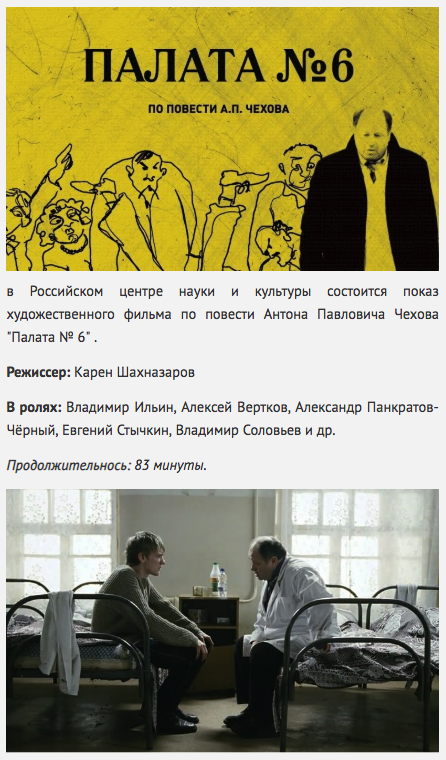 Художественный фильмапо повести Антона Павловича Чехова The Karen Shakhnazarov feature film “The Ward No. 6” based on the novel by Anton Chekhov will be shown at the Russian Center for Science and Culture. The main roles in the film were performed by Vladimir Ilyin and Alexey Vertkov. Фильм Карена Шахназарова "Палата №6" по повести А.П. Чехова Режиссер : Карен Шахназаров В ролях : Владимир Ильин, Алексей Вертков, Александр Панкратов-Чёрный, Евгений Стычкин, Владимир Соловьев и др. Главный врач провинциальной психиатрической больницы Андрей Ефимович Рагин обнаруживает в одном из своих пациентов (Громове) человека с оригинальным мышлением, более того — собственной философией. В беседах с душевнобольным доктор видит безумие мира и скоро сам теряет рассудок. Но кто вправе решать, где та грань, за которой начинается безумие?
