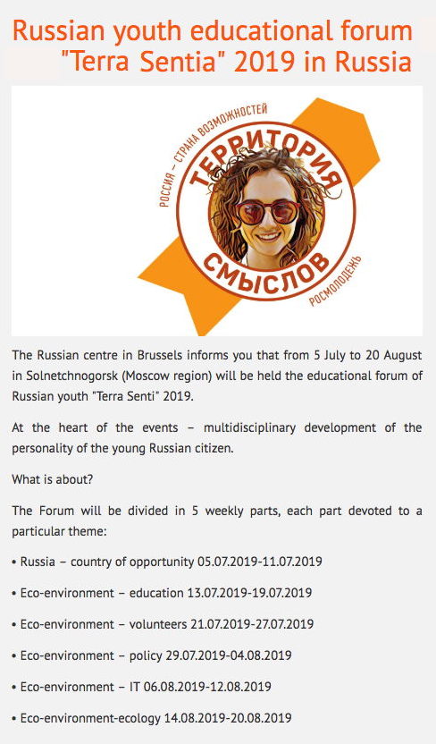 Всероссийский молодежный образовательный форум « Территория смыслов » 2019. The Russian centre in Brussels informs you that from 5 July to 20 August in Solnetchnogorsk (Moscow region) will be held the educational forum of Russian youth « Terra Sentia » 2019. At the heart of the events – multidisciplinary development of the personality of the young Russian citizen. What is about? The Forum will be divided in 5 weekly parts, each part devoted to a particular theme: • Russia – country of opportunity 05.07.2019-11.07.2019 • Eco-environment – education 13.07.2019-19.07.2019 • Eco-environment – volunteers 21.07.2019-27.07.2019 • Eco-environment – policy 29.07.2019-04.08.2019 • Eco-environment – IT 06.08.2019-12.08.2019 • Eco-environment-ecology 14.08.2019-20.08.2019 Each theme will contain trend-sessions (individual and colletive follow-up design for tactical and strategic changes), workshops, dialogues with leaders of public opinion and experts, networking, conferences, part Sports (competitions, gymnastics, running and outdoor games) and evening events (concerts, film demonstrations, contests...). The Forum aims to educate young people about traditional values and partiotic education, the development of international and interregional colloboration, the development of innovative projects and start-ups, the attraction of youth in the field of volunteerism the development of self-management, the attraction of youth to healthy lifestyles and sport, the popularization of the culture of security in the young universe and the support and interraction with organizations and movements Public.