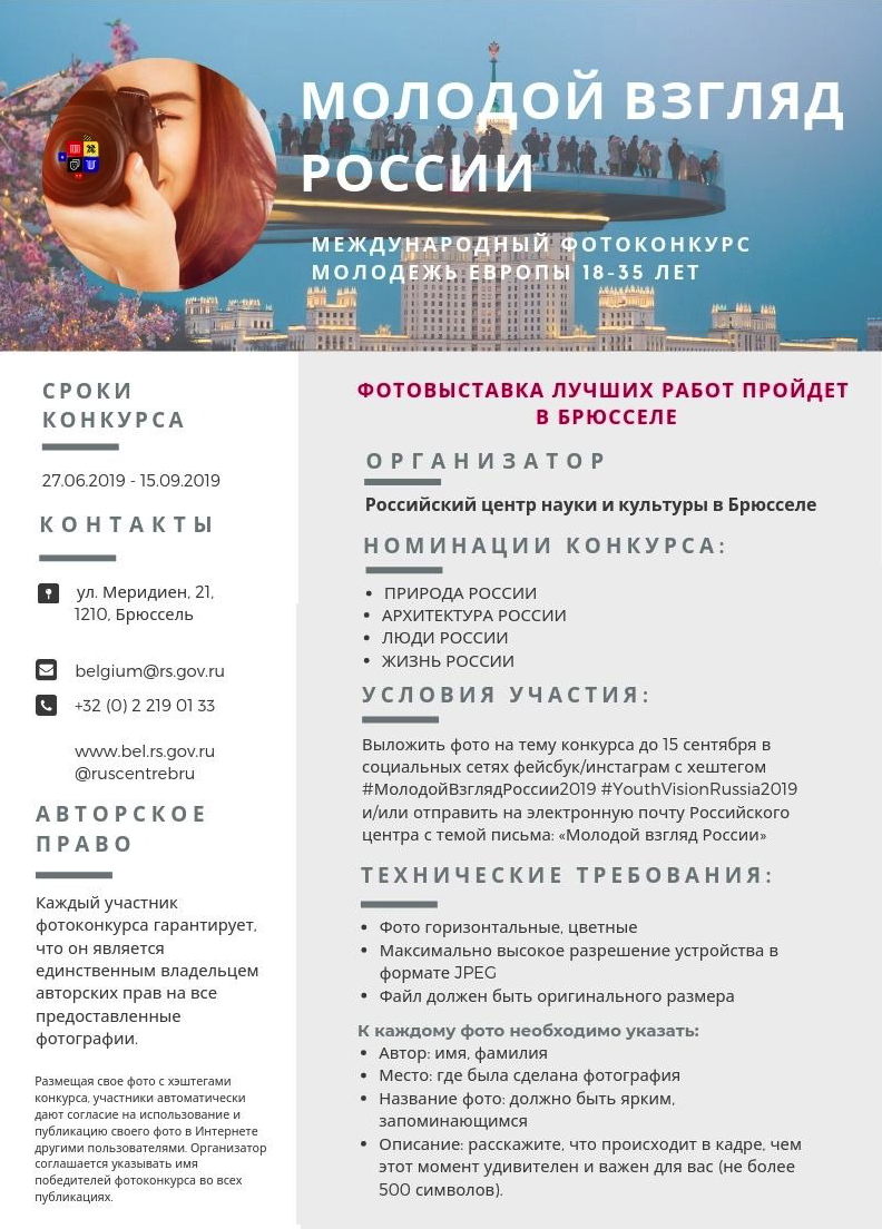 International Photo Contest « Youth Vision of Russia ». Российский центр науки и культуры в Брюсселе объявляет Международный Фотоконкурс « Молодой взгляд России », приуроченный ко Дню молодежи России. Цель конкурса : привлечь внимание молодежи со всей Европы к культуре, науке, искусству России, историческим событиям и мероприятиям в России, природе страны, уникальным ландшафтам и людям, ее населяющим. Условия участия в конкурсе : В конкурсе может участвовать молодежь Европы в возрасте от 18 до 35 лет, вне зависимости от гражданства и национальности. Сроки проведения открытого фотоконкурса: I этап : с 27 июня 2019 г. по 15 сентября 2019 г. (размещение фотографий в социальных сетях и приём работ по электронной почте на адрес организатора конкурса – belgium@rs.gov.ru), II этап : с 16 сентября 2019 г. по 25 октября 2019 г. (определение работ полуфиналистов и финалистов - победителей конкурса), III этап : 26 октября 2019 г. – проведение выставки фотографий победителей в Российском центре науки и культуры в Брюсселе. ГЛАВНЫЙ ПРИЗ : ВЫСТАВКА ФОТОГРАФИЙ В БРЮССЕЛЕ