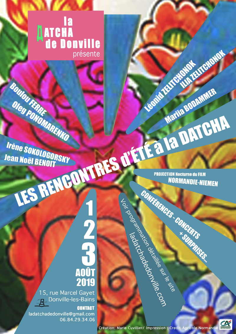 Datcha de Donville La Datcha de Donville poursuit ses rencontres d’été cette année, du 1er au Marie Cuvillier. Impression Crédit Agricole de Normandie 3 août 2019. Cette quatrième édition débutera le jeudi 1er août à 14 h 30 avec la conférences d’Irène Sokologorsky, professeure des universités en littérature russe, portant sur « les écrivains russes et la censure soviétique ». À 16 h 30, il sera également prévu une évocation théâtrale du couple mythique Marina Vlady et Vladimir Vissotsky par Mariia Bodammer. Le lendemain, une initiation au russe sera proposée par Maude Beck à partir de 15 heures. La deuxième journée reprendra à partir de 20 h 30. Jean-Noël Benoit, auteur et historien, tiendra en effet une conférence sur l’escadrille Normandie-Niémen, à l’issue de laquelle une projection nocturne du film « Normandie-Niémen » de Jean Dréville sera réalisée, ayant pour thème cette unité de l’armée de l’air française, ayant combattu aux côtés des soviétiques durant la seconde Guerre Mondiale. Il est également prévu des lectures de texte par Marina Vlady pré-enregistrées mettant en valeur à la fois le courage de ces soldats et la solidarité franco-russe. Enfin, le samedi 3 août est consacré à la musique, avec Boulou Ferré, et Oleg Ponomarenko, à la guitare et au chant ainsi que Léonid et Ilia Zelitchonok, multi-instrumentistes. Le répertoire comportera ainsi de nombreuses chansons traditionnelles russes, mais pas que … Les concerts débuteront à partir de 14 h 30. Ces rencontres se dérouleront à l’ombre des grands arbres du parc de la Gerbette, maison du XIXe siècle, à quelques pas de la mer. Un bar y sera ouvert afin de vous proposer de quoi boire et manger.