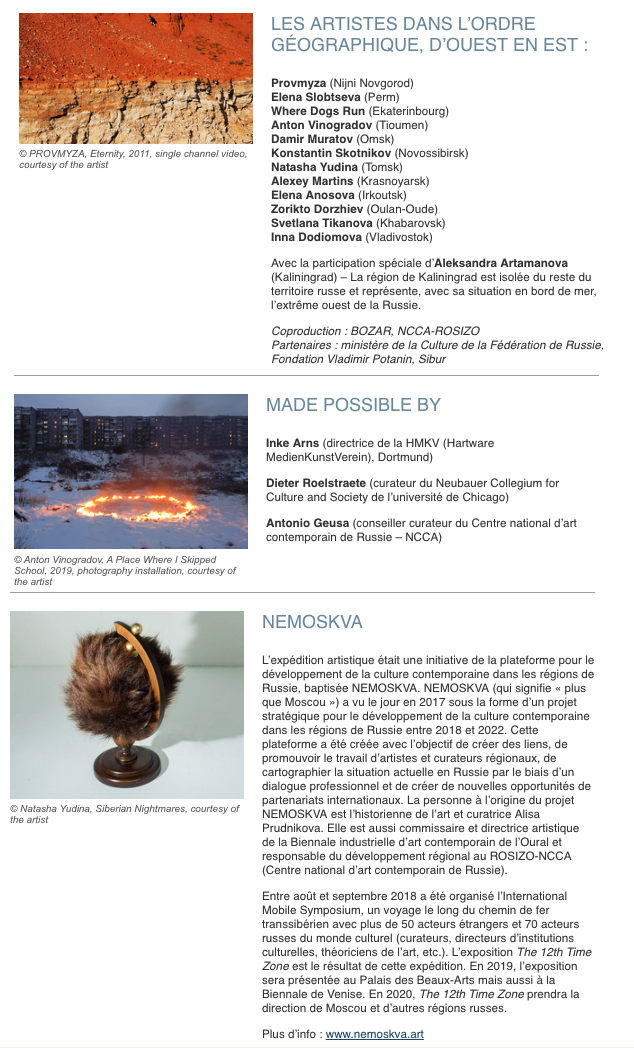 Nemoskva : L’expédition artistique était une initiative de la plateforme pour le développement de la culture contemporaine dans les régions de Russie, baptisée NEMOSKVA. NEMOSKVA (qui signifie « plus que Moscou ») a vu le jour en 2017 sous la forme d’un projet stratégique pour le développement de la culture contemporaine dans les régions de Russie entre 2018 et 2022. Cette plateforme a été créée avec l’objectif de créer des liens, de promouvoir le travail d’artistes et curateurs régionaux, de cartographier la situation actuelle en Russie par le biais d’un dialogue professionnel et de créer de nouvelles opportunités de partenariats internationaux. La personne à l’origine du projet NEMOSKVA est l’historienne de l’art et curatrice Alisa Prudnikova. Elle est aussi commissaire et directrice artistique de la Biennale industrielle d’art contemporain de l’Oural et responsable du développement régional au ROSIZO-NCCA (Centre national d’art contemporain de Russie). Entre août et septembre 2018 a été organisé l’International Mobile Symposium, un voyage le long du chemin de fer transsibérien avec plus de 50 acteurs étrangers et 70 acteurs russes du monde culturel (curateurs, directeurs d’institutions culturelles, théoriciens de l’art, etc.). L’exposition The 12th Time Zone est le résultat de cette expédition. En 2019, l’exposition sera présentée au Palais des Beaux-Arts mais aussi à la Biennale de Venise. En 2020, The 12th Time Zone prendra la direction de Moscou et d’autres régions russes.