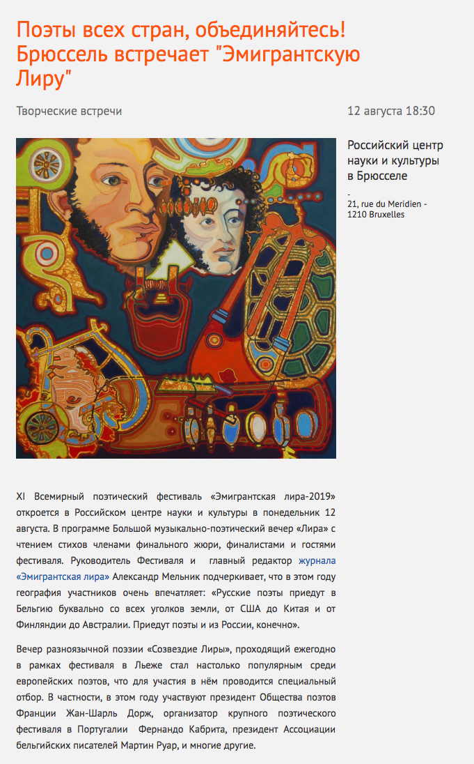 XI Всемирный поэтический фестиваль «Эмигрантская лира-2019» откроется в Российском центре науки и культуры в понедельник 12 августа. В программе Большой музыкально-поэтический вечер «Лира» с чтением стихов членами финального жюри, финалистами и гостями фестиваля. Руководитель Фестиваля и главный редактор журнала «Эмигрантская лира» Александр Мельник подчеркивает, что в этом году география участников очень впечатляет: «Русские поэты приедут в Бельгию буквально со всех уголков земли, от США до Китая и от Финляндии до Австралии. Приедут поэты и из России, конечно».