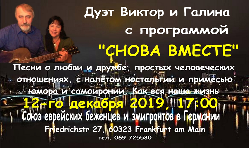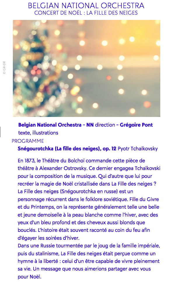 | 14 → Excursion autobus (Cologne/Bonn) 14-15 → Noël couleurs Russie (Forrières) 14 → Рождество Click Club (Aartselaar) 15,17,21 → Ballets Moroshka (Aix/Pau/Annecy) 16 → Faites entrer les musiciens (Paris) → 19 Je veux voir Mioussov (Paris) 19-20 → Concert de Noël (Bruxelles) 19 → Noël - Musiques de films (Paris) → 20 Intarsien-Kreativ Natur (Sossenheim) → 20 Tziganes 2 Guerre mondiale (Guipavas) 20-21 → Fille des neiges (Bruxelles) 20-31 → The Nutcracker (Sint-Niklaas/Namur/Bruxelles/Liège/Berlin) 22 → De Notenkraker (Beernem) 22 → Новогодняя сказка (Ougrée) → 24 Minin(g) (Marcinelle) 27-30 → Casse-Noisette (Bruxelles) 28-30 → De notenkraker(Gent/Forest) 29 → Брейгель в черно-белом (Bruxelles) → 5/1 Rodchenko. Kazan Art (Saint-Josse) → 31/1 ERA.Net RUS Plus Call 2019 (Gent) → 1/2 Hommage Maurice Ravel (Oostende/Longuenesse/Antwerpen/Mons/Gent/Liège)