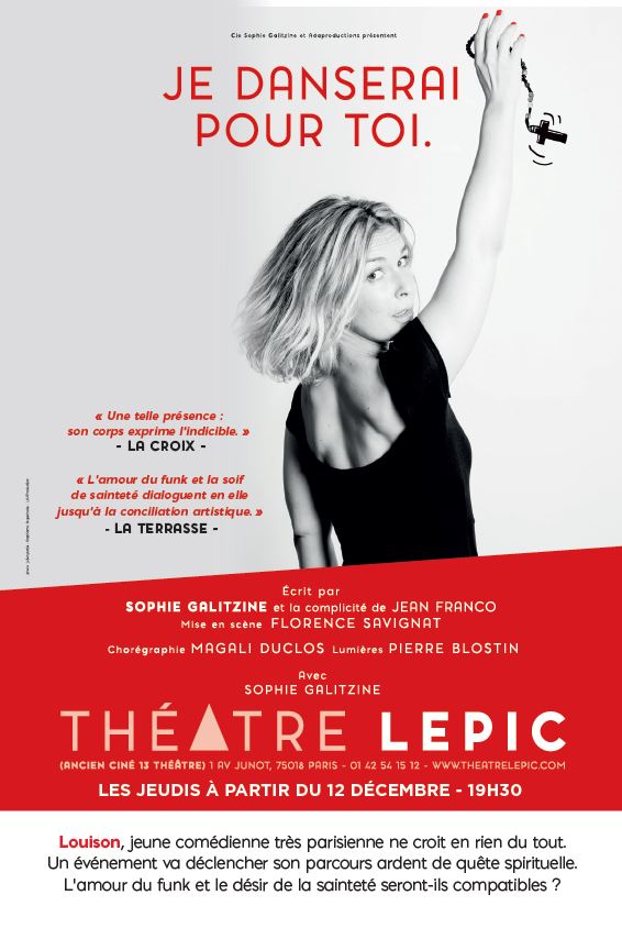Je danserai pour toi. Il s'agit d'une œuvre semi-autobiographique en deux parties, un diptyque dont la première partie raconte son parcours familial et sa quête de spiritualité. Dans la seconde partie, l’héroïne a fait une rencontre décisive qui donne un sens à sa vie. C'est alors que les difficultés commencent.... Un spectacle remarquable dans lequel cette jeune artiste brille à la fois en tant qu'auteur, comédienne et danseuse. Une révélation ! Louison, jeune comédienne très parisienne ne croit en rien du tout. Un événement va déclencher son parcours ardent de quête spirituelle. L'amour du funk et le désir de la sainteté seront-ils compatibles ? Voici l’histoire de Louison , jeune comédienne et danseuse, très parisienne, qui aime le vernis rouge, changer d’amoureux, danser sur Madonna et ne croit pas du tout en Dieu. Le décès de son père va tout bousculer et la pousser vers une quète de sens radicale. C’est l’histoire de son parcours ardent qui la mènera vers plusieurs spiritualités, avant de trouver le christ de façon inattendue. L’amour du funk et la soif de sainteté s’exclueront-ils ou seront-ils compatibles? Un spectacle vibrant et intime, rythmé par l’humour, parfois grinçant, et les flashs back d’une histoire tourbillonnante. Le fruit de nos entrailles. Voici Max et Louison et l'odyssée de leur couple au comment aimer au quotidien et radicalement dans le don de soi et grâce à la Présence qui transcende tout. “C’est l’histoire de Louison et Max, de leur rencontre, de leur mariage, de leur vie au quotidien, avec ses joies et ses chagrins, jusqu’à leur grande vieillesse ensemble. C’est l’histoire d’un couple actuel qui a décidé de se choisir et d’oser la folie de l’engagement jusqu’au bout du bout et même au-delà. A une époque, où la liberté parait être de pouvoir changer de tout tout le temps et quand je veux, en quoi se main-tenir et rester, ouvrir grand et déposer un oui franc et engagé, peut-être à la source d’une grande liberté. Et s’il fallait pour y parvenir, accueillir dans son couple une troisième personne, une altérité transcendante ? Et que la porte était l’union des corps, comme source de joie. Avec la danse et le théâtre, l’humour et l’angoisse, la tendresse et la violence, Sophie Galitzine donne à percevoir la liberté qui nait de l’engagement dans le couple. “ Bien cordialement, Catherine Galitzine