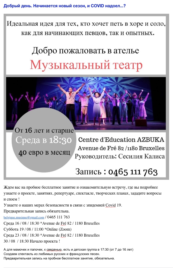 Сесилия Калиса Добрый день. Начинается новый сезон, и COVID надоел...? Идеальная идея для тех, кто хочет петь в хоре и соло, как для начинающих, так и опытных. Ждём вас на пробное бесплатное занятие и ознакомительную встречу, где вы подробнее узнаете о проекте, занятиях, репертуаре, спектакле, творческих планах, зададите вопросы и споем ! А для мамочек и папочек, к сведенью, есть и детская группа в 17:30 (от 7 до 16 лет) Создаём спектакль из любимых русских и французских песен.