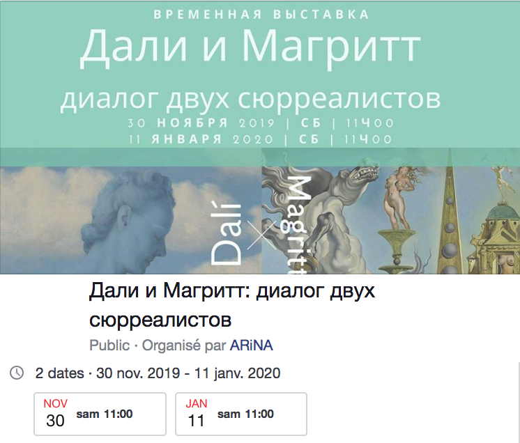 Diffusion de janvier 2020. Calendrier d'événements à caractère culturel russe.Calendrier d'événements à caractère culturel russe Janvier 2020 Lien pour visualiser ce courriel dans votre navigateur Mail/RC_Mailing_January_01,_2020.html | Calendrier vava.be décembre 2019 | Liste des intitulés | Album des affiches/illustrations | Descriptifs détaillés | Nouvelles affiches | Diaporama 25, 29-30/12, 1/1 → Noël Russe choeur de St-Pétersbourg (Paris) 27-30/12 → Casse-Noisette (Bruxelles) 28/12 → Прогулка по Генту (Gent) 28/12 → Дуэт Волна (Antwerpen) 29/12 → Брейгель (Bruxelles) 30/12 → Morphine (Saint-Josse) 31/12 → Réveillon Новый Год 2020 (Maisons-Alfort) → 4/1 Salon Noël Monastère Minsk (Auderghem) → 5/1 Rodchenko (Saint-Josse) → 31/1 ERA.Net RUS Plus Call 2019 (Gent) → 1/2 Maurice Ravel (Oostende/Longuenesse/Antwerpen/Mons/Gent/Liège) 4/1→ Noël russe (Evreux) 11/1 → Pierre et le loup (Liège) 11-13,17-19/1 → Rusquartet (Steinfurt/Willebroek/Kempten/Dilbeek/Lanaken/Essen) 11/1 → Russian Old New Year (Den Haag) 11/1 → Old New Year from Siberia (Saint-Josse) 11/1 → Пришла Коляда (Antwerpen) 11/1 → Дали и Магритт (Bruxelles) 12/1 → Concert Les Cosaques (Paris)