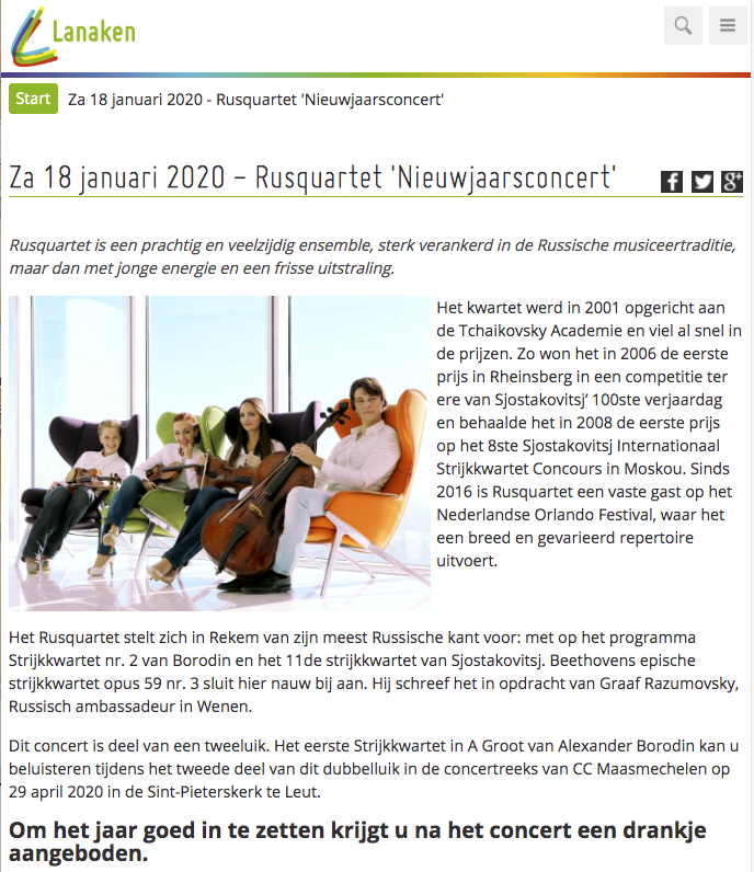 Diffusion de janvier 2020. Calendrier d'événements à caractère culturel russe.Calendrier d'événements à caractère culturel russe Janvier 2020 Lien pour visualiser ce courriel dans votre navigateur Mail/RC_Mailing_January_01,_2020.html | Calendrier vava.be décembre 2019 | Liste des intitulés | Album des affiches/illustrations | Descriptifs détaillés | Nouvelles affiches | Diaporama 25, 29-30/12, 1/1 → Noël Russe choeur de St-Pétersbourg (Paris) 27-30/12 → Casse-Noisette (Bruxelles) 28/12 → Прогулка по Генту (Gent) 28/12 → Дуэт Волна (Antwerpen) 29/12 → Брейгель (Bruxelles) 30/12 → Morphine (Saint-Josse) 31/12 → Réveillon Новый Год 2020 (Maisons-Alfort) → 4/1 Salon Noël Monastère Minsk (Auderghem) → 5/1 Rodchenko (Saint-Josse) → 31/1 ERA.Net RUS Plus Call 2019 (Gent) → 1/2 Maurice Ravel (Oostende/Longuenesse/Antwerpen/Mons/Gent/Liège) 4/1→ Noël russe (Evreux) 11/1 → Pierre et le loup (Liège) 11-13,17-19/1 → Rusquartet (Steinfurt/Willebroek/Kempten/Dilbeek/Lanaken/Essen) 11/1 → Russian Old New Year (Den Haag) 11/1 → Old New Year from Siberia (Saint-Josse) 11/1 → Пришла Коляда (Antwerpen) 11/1 → Дали и Магритт (Bruxelles) 12/1 → Concert Les Cosaques (Paris)
