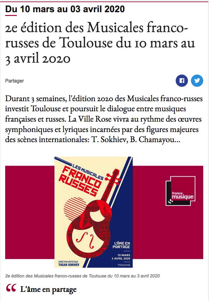 Сайт/Site : http://www.lesmusicalesfrancorusses.fr/https://www.francemusique.fr/evenements/2e-edition-des-musicales-franco-russes-de-toulouse-du-10-mars-au-3-avril-2020