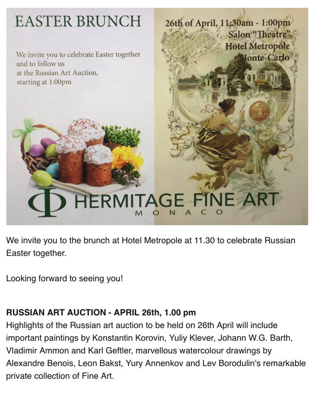 Chantal Beauvois et Franck Baille Chers collectionneurs, chers clients, J’ai le plaisir de vous présenter la prochaine vente d'une collection entière axée sur les Ballets Russes qui se tiendra le 2 avril 2019 à 15h00 sous le ministère de l’Hôtel des Ventes de Monte-Carlo, situé 10/12, quai Antoine Ier, 98000 Monaco Le catalogue sera bientôt disponible directement auprès de l’étude, ou d'ors et déjà sur le site de l’expert ou bien en cliquant directement sur l’image ci-dessous (ctrl+clic en fonction des navigateurs). The catalogue will be soon available directly at HVMC, or is already available on the specialist’s website, or by clicking directly on the image above (ctrl+clic depending on your browser). Je reste à votre disposition pour tout renseignement. Bien cordialement, Cyrille Boulay, Expert Art Russe et Souvenirs Historiques