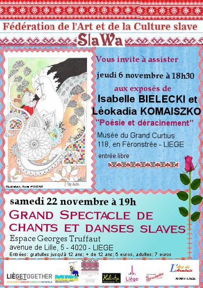 October 2014 : Calendrier d'événements relatifs à la culture russe.Voici le lien vers la liste des 53 événements culturels déjà enregistrés pour ce mois de novembre 2014. Notons que décembre rassemble déjà 21 annonces et l'année 2015 en compte 31. Impossible donc de tout citer dans ce texte! Ne nous en tenez pas rigueur. Alors que la troupe Koukouchechka de Bobrouisk poursuit sa tournée, Julietta propose déjà une petite soirée en chansons ce 7 novembre au Sans Interdit. Nous avons été ravis d'assister au tout premier concert donné par sa toute nouvelle asbl Triomphe de l'Art et dont Radio-Rubel a assuré le reportage. Le lendemain 8 novembre « Parfum d’Ambre » nous invite à son double événement qui met l'âme slave à l'honneur. Nous aimons annoncer les concerts parisiens de Natacha ainsi bientôt son Récital Fusion puis Sainte-Cécile. Nos amis liégeois nous offrent une soirée russe au musée du Fort à Boncelles, tandis que Halinka nous revient à Bruxelles avec son expo « Détails pierre - bronze ». Enfin, ne rater sous aucun prétexte le 28 novembre le prestigieux Gala « Patrimoine Russe » au Château du Lac à Genval ainsi que le 25 novembre la petite prestation de notre chorale « Rossa i Nota » en l'Eglise Sainte-Alix de Woluwé-Saint-Pierre. | |