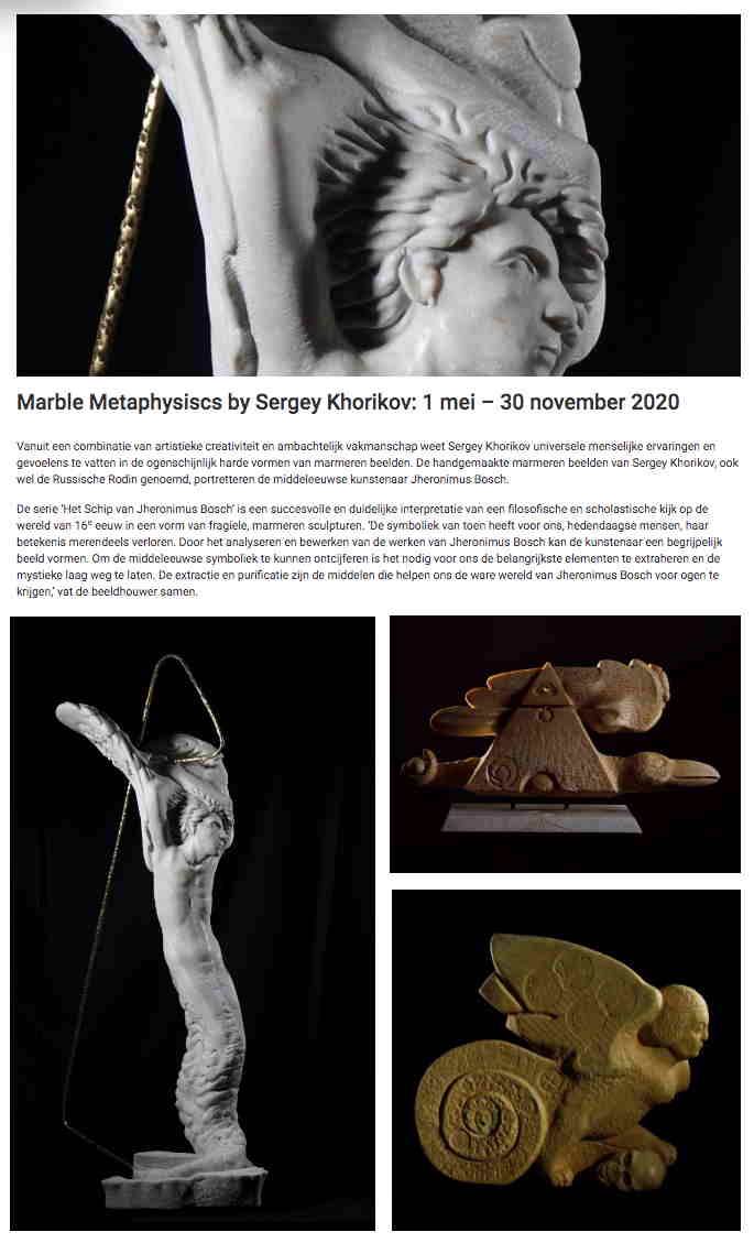 Vanuit een combinatie van artistieke creativiteit en ambachtelijk vakmanschap weet Sergey Khorikov universele menselijke ervaringen en gevoelens te vatten in de ogenschijnlijk harde vormen van marmeren beelden. De handgemaakte marmeren beelden van Sergey Khorikov, ook wel de Russische Rodin genoemd, portretteren de middeleeuwse kunstenaar Jheronimus Bosch.