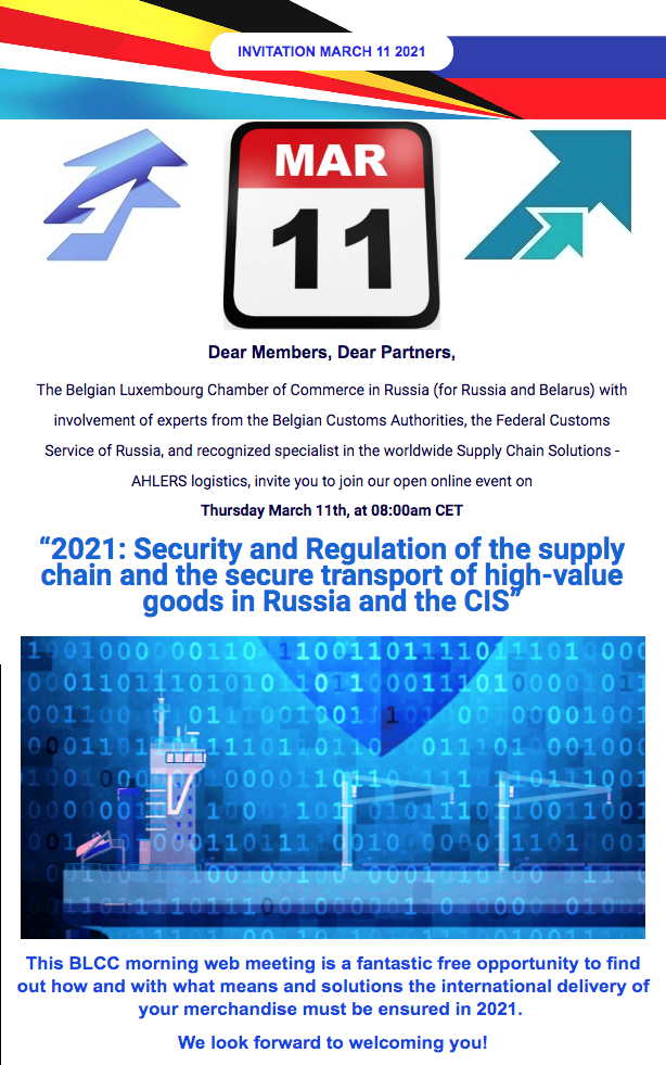 Dear Members, Dear Partners, The Belgian Luxembourg Chamber of Commerce in Russia (for Russia and Belarus) with involvement of experts from the Belgian Customs Authorities, the Federal Customs Service of Russia, and recognized specialist in the worldwide Supply Chain Solutions - AHLERS logistics, invite you to join our open online event This BLCC morning web meeting is a fantastic free opportunity to find out how and with what means and solutions the international delivery of your merchandise must be ensured in 2021. We look forward to welcoming you! Programme : 8:00 am - Welcome and introduction President of BLRB Chamber of Commerce, CEO at AHLERS, Stefan Van Doorslaer and BLCC Russia CEO, Member of the Board, Oleg Prozorov 8:05 am - Belgian Customs Representative, at the Belgian Embassy in Moscow, Emmanuel Geronnez Export control on dual use goods in the European Union Certain goods and technologies have legitimate civilian applications but can also be used for military purposes; so-called 'dual-use' goods are subject to the European Union's export control regime. The regime has just been revised, mainly to take account of significant technological developments, increase transparency and create a more level playing field. Dmitry Gennadievich Subochev On the Russian state system for tracking cargo transportation using electronic navigation seals based on GLONASS The use of electronic seals with GLONASS navigating technology (Russian analogue of GPS) is obligatory for the transit transportation of EU products via the Russian territory. Besides the new requirements, the Russian authorities use a new traffic control system. The electronic seals is its basement to provide the possibility of obtaining information from various seals that are not necessarily functioning on the joint platform. 8:35 am - Director of High Value Logistics Division at Ahlers Belgium Ellen Theeuwes Emergency in supply chain security and secure transport of high value goods in Russia and CIS Practical examples of how your business can benefit from Ahlers Safe-T solution. Answers to your questions, or challenges you might face today such as: How to ensure public and employee safety during transport? And what about limiting human interaction? How to reduce the impact of theft and cargo crime on product availability and brand reputation? How to rule any supply chain disruption due to hijackings? How to avoid paying increased insurance premiums?