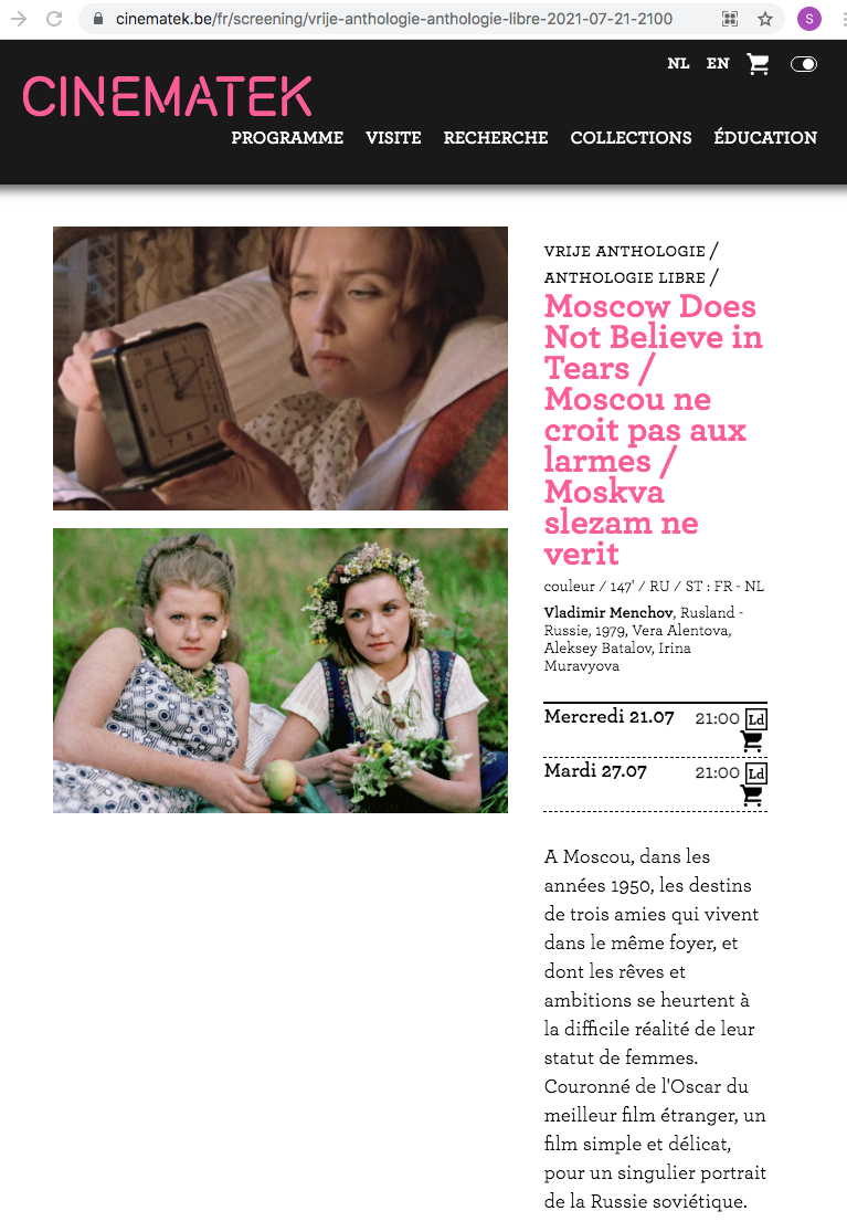 Vladimir Menchov, Vera Alentova, Aleksey Batalov, Irina Muravyova Russie / 1979 / Couleur / 147' / Sous-titres : Français, Néerlandais A Moscou, dans les années 1950, les destins de trois amies qui vivent dans le même foyer, et dont les rêves et ambitions se heurtent à la difficile réalité de leur statut de femmes. Couronné de l'Oscar du meilleur film étranger, un film simple et délicat, pour un singulier portrait de la Russie soviétique.