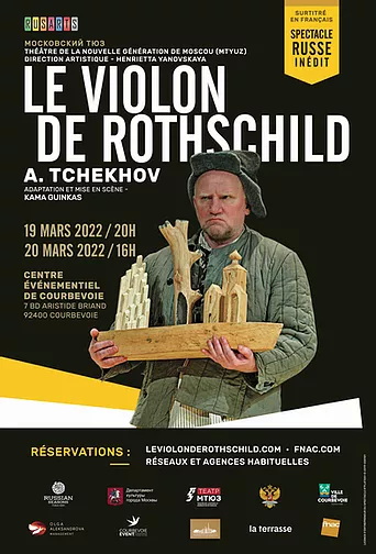 Adaptation et mise en scène - Kama Guinkas. Scénographie - Sergey Barkhin Musique - Leonid Dessiatnikov / Lumières - Gleb Filshtinsky / Spectacle en russe surtitré en français. Théâtre de la Nouvelle Génération de Moscou (MTYUZ) Tchekhov comme vous ne l'avez jamais vu! Le spectacle « Le Violon de Rothschild » a été créé en 2004 et il fait partie du Fonds national russe de spectacles ayant obtenu les récompenses les plus prestigieuses: « The Golden Mask », « The Crystal Turandot », Prix Stanislavski… Kama Guinkas est un pilier du théâtre russe connu pour son style provocant. Chaque son spectacle est un événement pour le public aussi bien que pour le monde théâtral. "Le Violon de Rothschild" fait partie de la fameuse trilogie de spectacles de Kama Guinkas « La vie est belle. D’après Tchekhov ». La vie est belle. d'après Tchekhov Tchekhov détestait les paraboles, les fables car il évitait les leçons de morale. En effet, Tchekhov dit dans son récit pour la première fois directement les choses qu’il dénonça toute sa vie. Il écrit une parabole où il se permet de dire de manière directe ce qui le dérange. Il écrit une nouvelle sur la vie vaine ou la vie privée de sens. Presque tous les personnages de Tchekhov en prennent conscience en fin de compte. S’ils ne se rendent pas compte, nous, les lecteurs, comprenons que tant de temps s’est écoulé en vain. Et rien! Il n’y avait rien dans la vie. Il y avait un fleuve, des bateaux, des oies, un enfant... Iakov Bronza a eu un enfant! La femme, il a eu une femme! Il ne se rappelle pas ni de l’un, ni de l’autre. Kama Guinkas. Le personnage principal, Iakov, est le fabricant de cercueils d’une petite ville à la campagne. Il est fâché contre la vie car les habitants de la ville ne meurent pas assez pour que ses affaires soient florissantes. Sa vie ne se résume qu’à des pertes : pertes liées aux jours non travaillés, aux habitants qui décident de mourir dans la ville voisine,… Pour arrondir les fins de mois, il joue du violon quand on fait appel à lui dans un orchestre tenu par le juif Moïséi Chaklès. Il éprouve une réelle aversion pour le flutiste juif Rothschild. Quand Marfa, sa femme, tombe malade puis décède, Iakov se rend compte qu’elle a tout enduré en silence : la perte d’un enfant en bas âge, les coups qu’il lui assénait, sa mauvaise humeur. Veuf, il comprend trop tard qu’il est passé à côté de beaucoup de belles choses dans la vie. Frappé du même mal que sa femme, il lègue son violon avant de mourir à Rothschild.