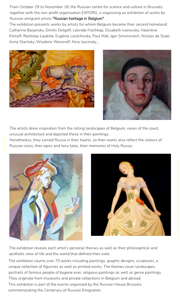 Dans le cadre de la commémoration du centenaire de l’émigration L’Association de la noblesse d’origine russe résidant en Belgique, en coopération avec la Maison Russe - Bruxelles Europe et l’ Asbl EXPORG Du 29 octobre au 18 novembre 2021, le Centre culturel et scientifique de Russie à Bruxelles, en collaboration avec l'organisation à but non lucratif EXPORG, organise une exposition d’œuvres réalisées par des artistes émigrés russes « Le patrimoine russe en Belgique ». L'exposition présente des œuvres d'artistes pour qui la Belgique est devenue leur deuxième patrie : Catherine Barjansky, Dimitri Dolgoff, Léonide Frechkop, Elisabeth Ivanovsky, Valentine Klimoff, Rostislas Loukine, Eugénie Loutchinsky, Paul Mak, Igor Simonovitch, Nicolas de Staël, Anna Staritsky, Wladimir Woronoff, Nina Jascinsky... Les artistes se sont inspirés des paysages vallonnés de la Belgique, des vues sur la côte et de l'architecture inhabituelle et les ont représentés dans leurs peintures. Ils portaient en même temps la Russie dans leur cœur, donc leurs œuvres sont traversés par les couleurs de ses icônes, ses épopées, ses contes de fées et leurs souvenirs de la Sainte Russie. L’exposition fait connaitre leurs thèmes principaux et dévoile leur regard philosophique et esthétique sur la vie et le monde qui définit leur exil. L'exposition comprend plus de 70 œuvres de peinture, de graphisme, de sculpture, une collection unique de figurines ainsi que des œuvres imprimées provenant de musées et de collections privées en Belgique et à l'étranger : paysages, portraits de personnages célèbres d'une époque révolue, peinture religieuse et peinture de genre. Cette exposition est liée aux événements organisés par la Maison Russe à Bruxelles autour de la commémoration du centenaire de l’Exode russe.