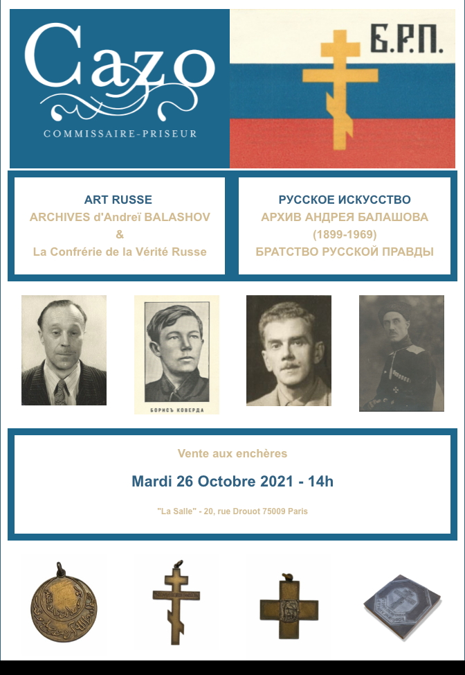 Cazo, Commissaire-Priseur, La Salle - Paris Les archives d’Andreï Balashov[*] constituent une somme de documents de première importance pour comprendre l’organisation de la résistance à l’Union soviétique à l’étranger par un réseau d’anciens officiers de l’Armée blanche. Andreï Balashov (1899-1969) fut tout à la fois officier de l’Armée Blanche, hussard, poète et peintre. Il a participé à la guerre civile au sud de la Russie avant d’être évacué avec le reste de l’armée en 1920. Pendant trois ans, Andreï Balashov reste avec les troupes du général Koutepov à Gallipoli, armé et prêt à repartir au combat. Puis, émigré d’abord en Serbie, il se retrouve à Bruxelles où pendant des décennies il sera à la tête de la Confrérie de la Vérité russe en Belgique. Andreï Balashov est ainsi à l’origine de toute la propagande de la Confrérie, des ordres et décorations militaires. Il fut l’un des principaux chefs de l’organisation, s’occupant tout aussi bien de trouver des financements que de mener des actions militaires importantes. Par ailleurs auteur de plusieurs recueils poétiques, A. Balashov a édité plusieurs livres du fameux écrivain patriote A. Amfiteatrov. Ayant consacré toute sa vie en émigration au combat contre l’Union soviétique, Andreï Balashov est un personnage clé pour la compréhension du rôle de la Confrérie de la Vérité russe. La Confrérie de la Vérité russe est une organisation monarchique russe à l’étranger. Créée par plusieurs généraux de l’Armée blanche en 1921, dirigée par S. Sokolov-Kretchetov, G. Leikhtenbergsky et A. Liven, elle revêtait un caractère secret en raison de son rôle militaire très actif. Organisée à partir d’un réseau de frères ne communiquant entre eux que sous pseudonymes ou numéros, elle fut active dans une trentaine des pays. Mais du fait de ce caractère secret, elle reste actuellement très peu étudiée par des historiens. Les archives présentées aux enchères sont à ce titre une source historique capitale pour comprendre la structure et l’organisation de la Confrérie de la Vérité russe. Elles dévoilent son rôle dans les affaires d’espionnage les plus marquantes dans l’histoire russe du XXe siècle. De nombreux documents sont totalement inédits! [*] Attention! orthographié Balachoff dans les illustrations des archives présentées dans le catalogue.